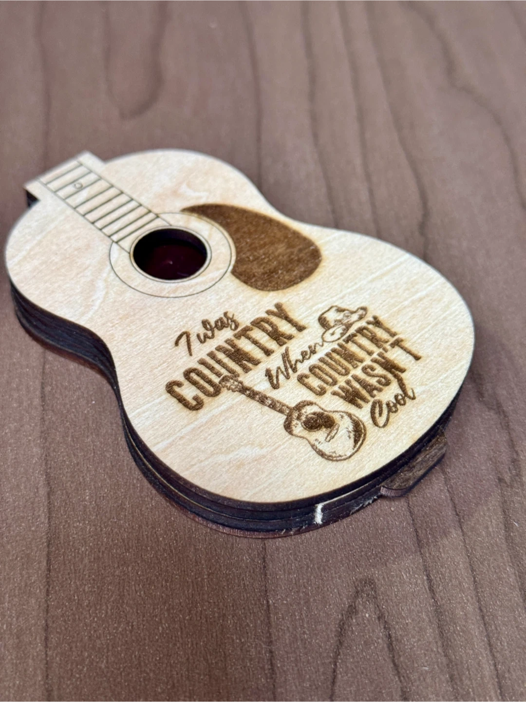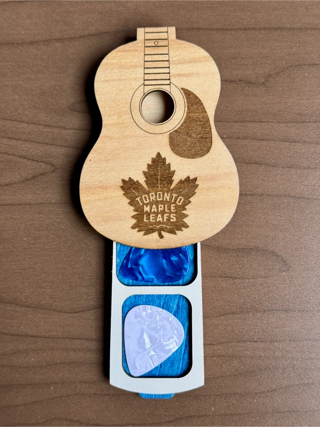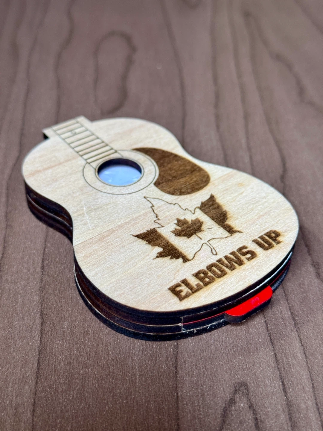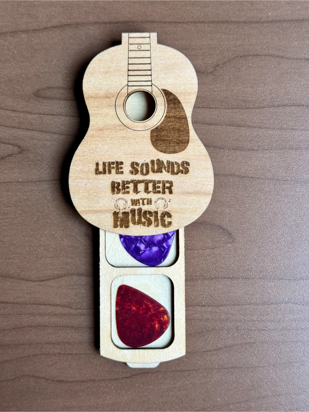 For sale: Made by me, laser cut & engraved guitar pick holders (Acoustic & Electric guitar versions) with MANY different designs and graphics - 40 custom designs currently available and changing all the time. Pocket size and portable. Holds 2-6 picks depending on the thickness of the picks. Made from 4 layers of Basswood.