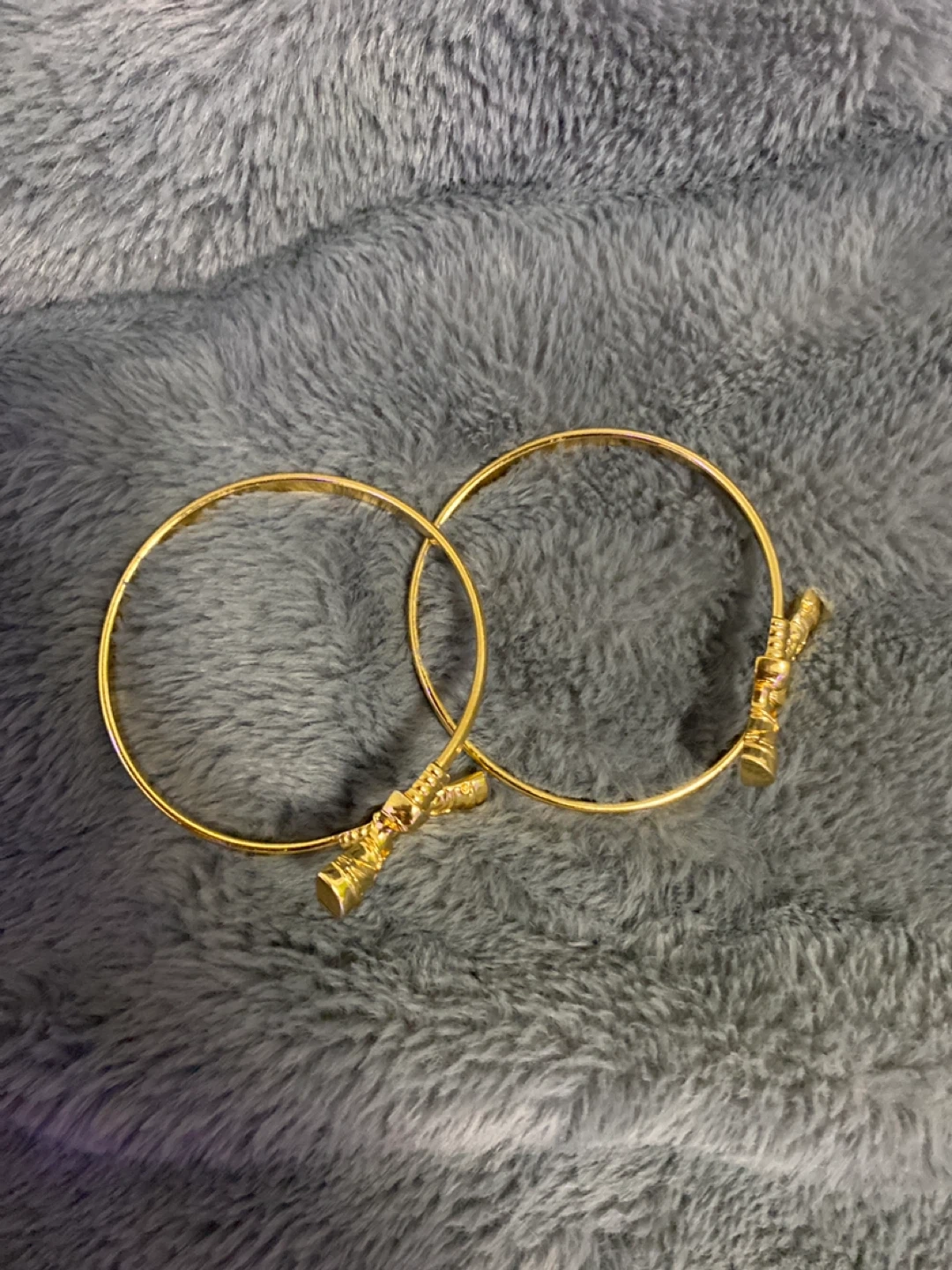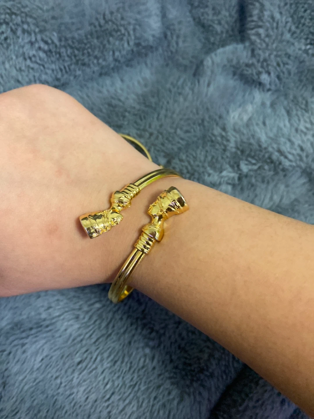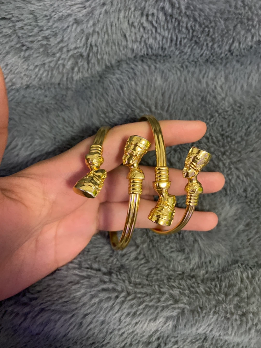 This set includes two gold tone cuff bracelets. Each cuff is designed with a detailed Nefertiti bust at each end. They offer a unique statement piece for any jewellery collection.