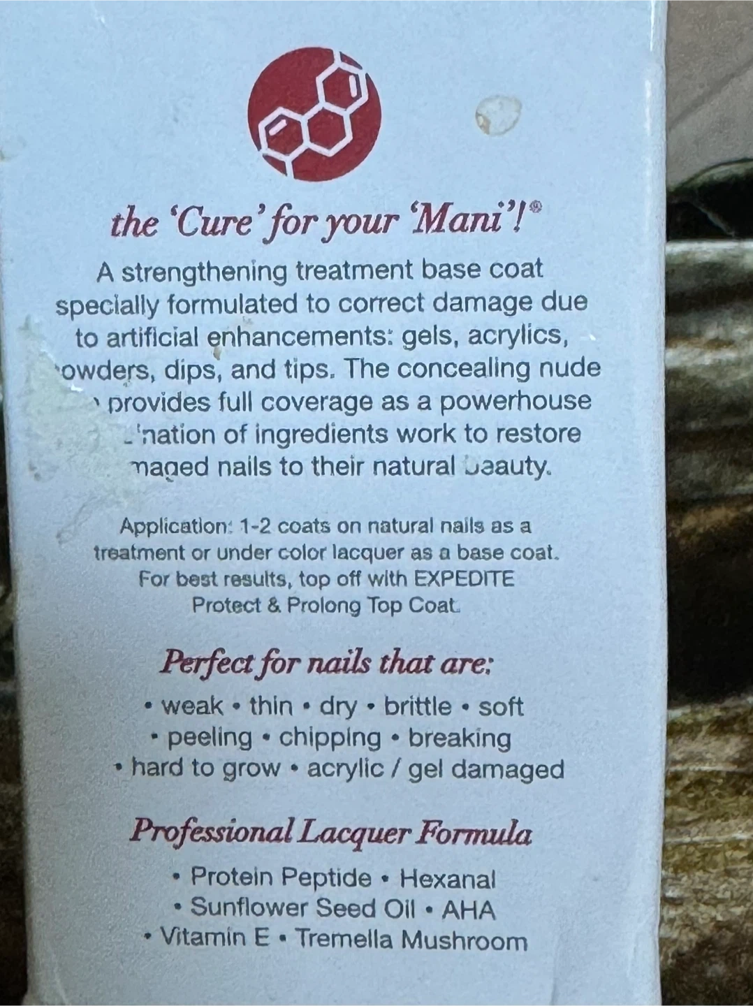 A strengthening treatment base coat specially formulated to correct damage due to artificial enhancements. It's peptide infused and contains Sunflower Seed Oil, AHA, and Vitamin E. Perfect for weak, thin, dry, brittle, soft, peeling, chipping, breaking, hard-to-grow, or acrylic/gel damaged nails.