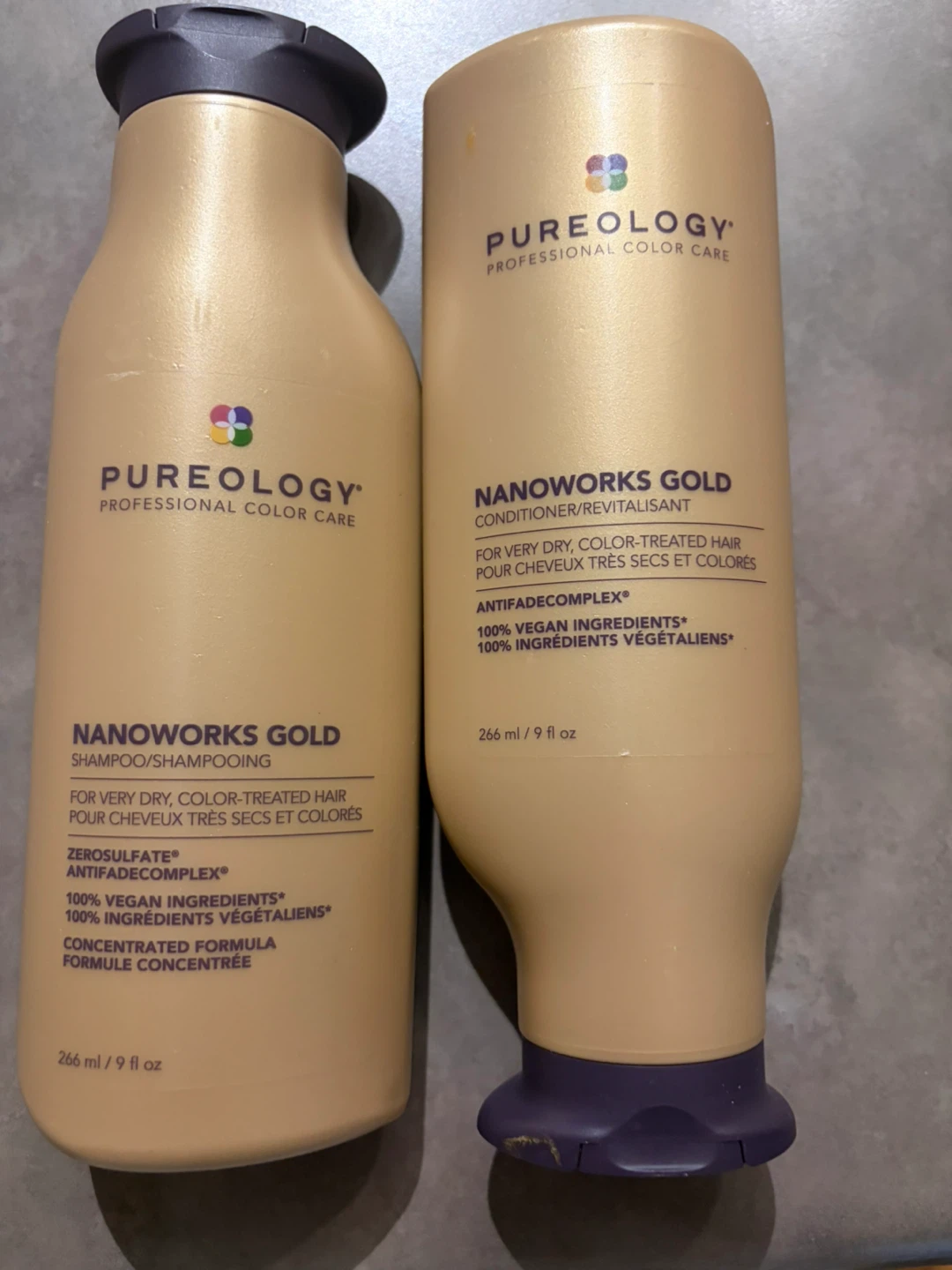Selling a set of Pureology Nanoworks Gold shampoo and conditioner. Both are for very dry, colour-treated hair and come in 266ml/9 fl oz bottles. They feature the Antifadecomplex and are made with 100% vegan ingredients!