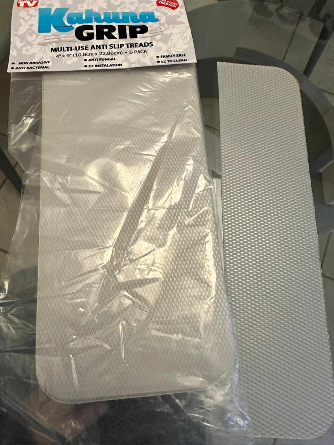 Selling a pack of Kahuna Grip Multi-Use Anti Slip Treads. Each tread measures 4" x 9" (10.16cm x 22.86cm). There are 5 and a half treads in the pack. These treads are non-abrasive, anti-bacterial, anti-fungal, and easy to clean. They are also family safe and easy to install