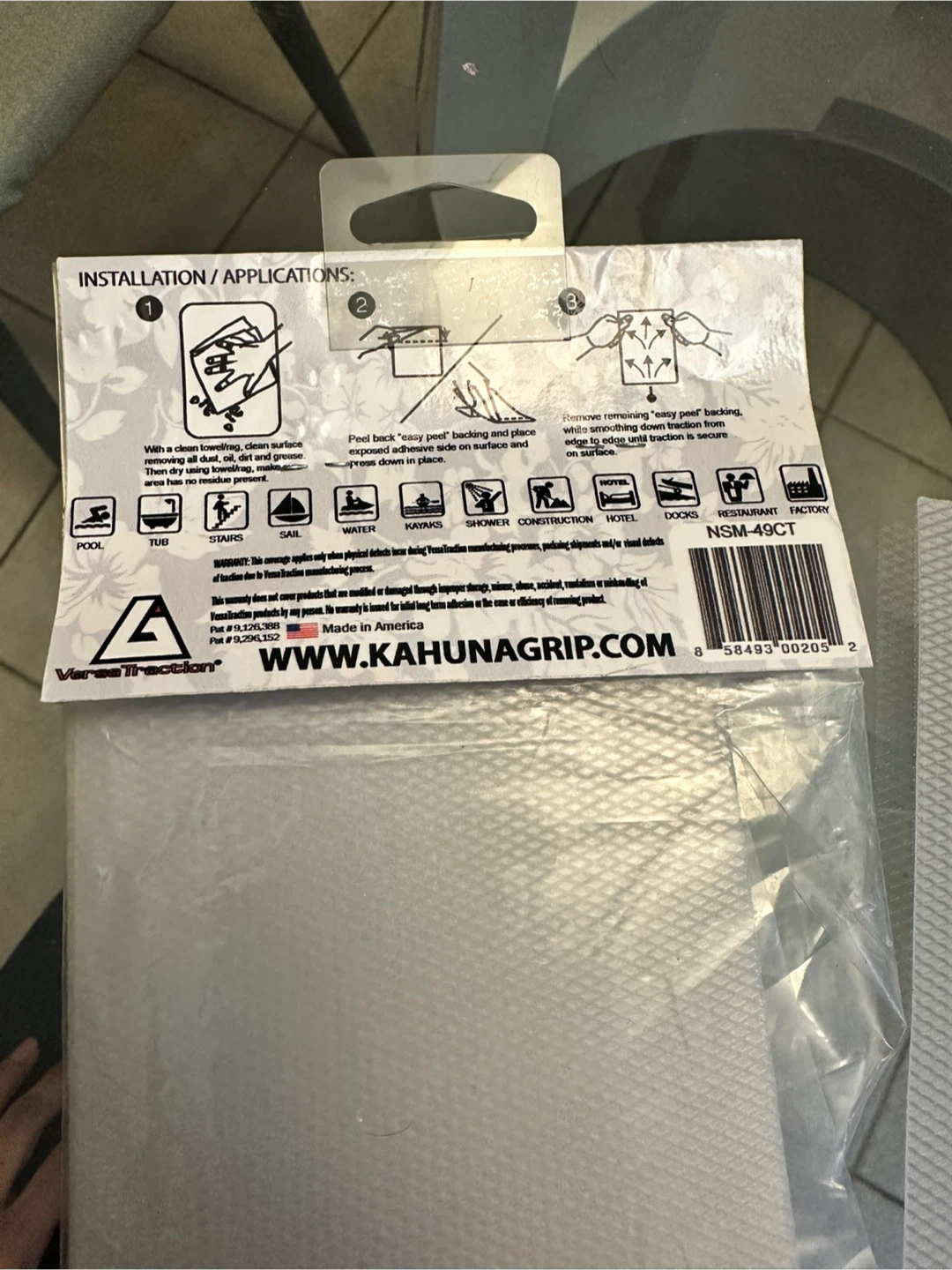 Selling a pack of Kahuna Grip Multi-Use Anti Slip Treads. Each tread measures 4" x 9" (10.16cm x 22.86cm). There are 5 and a half treads in the pack. These treads are non-abrasive, anti-bacterial, anti-fungal, and easy to clean. They are also family safe and easy to install