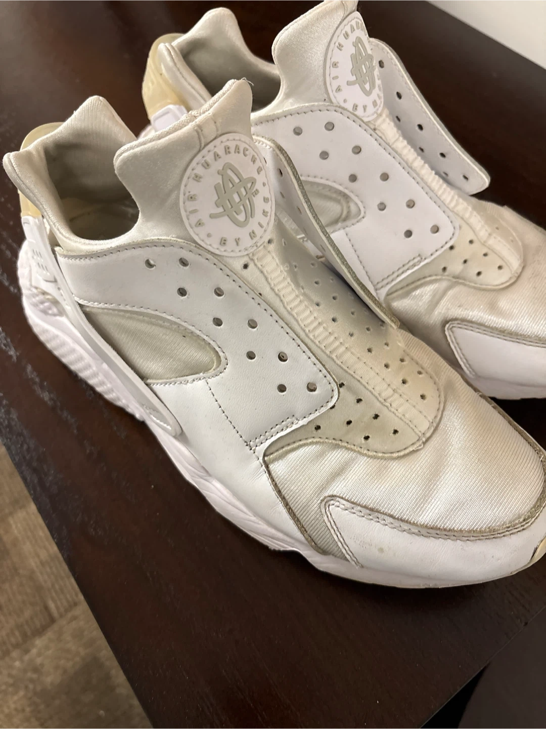 White Nike Air Huarache shoes. They feature a classic neoprene sleeve and a durable rubber sole. These are a women's size 7.