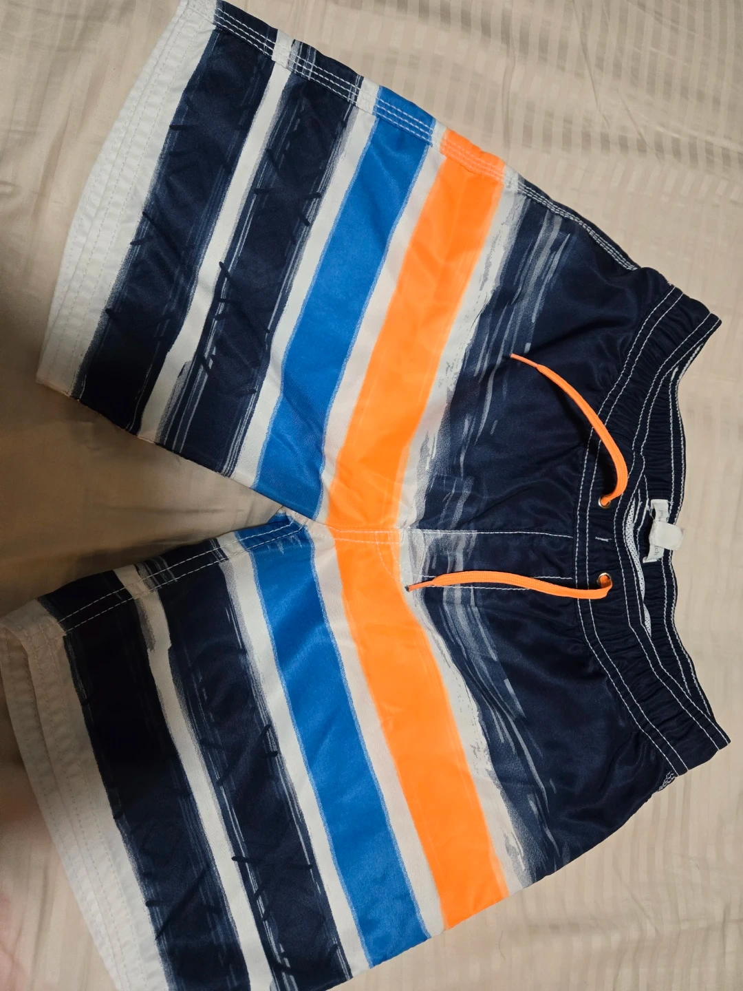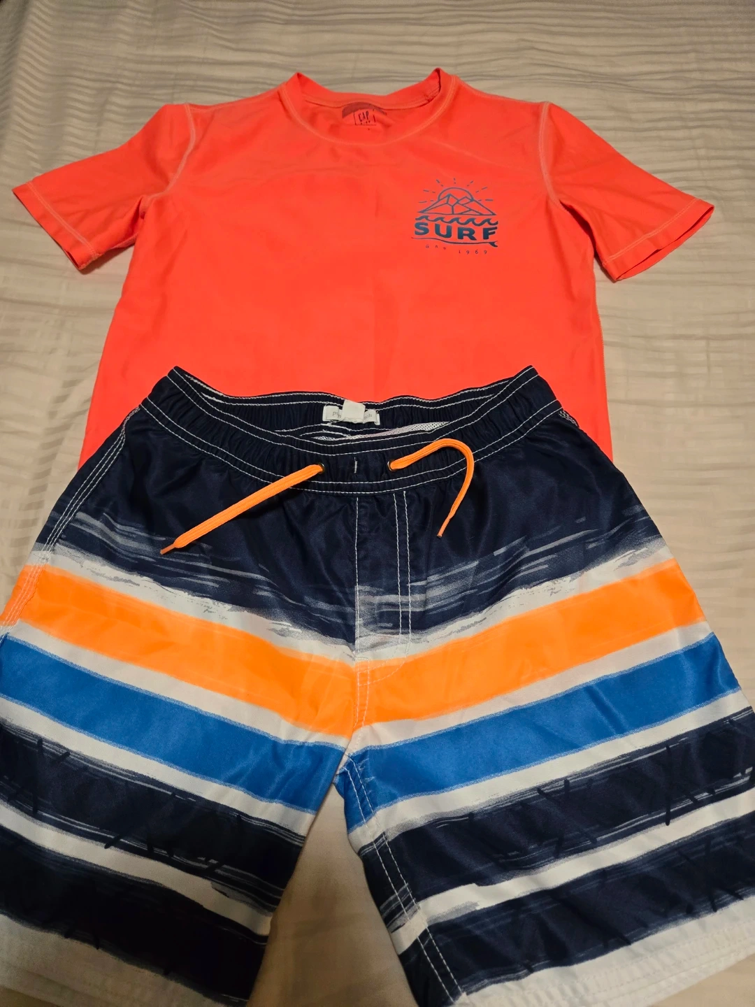 Selling a pair of Pumpkin Patch swim trunk & GAP swim top in size 9-10! The swim pant feature a vibrant striped pattern with blue, orange, and white. Perfect for a day at the beach or pool!