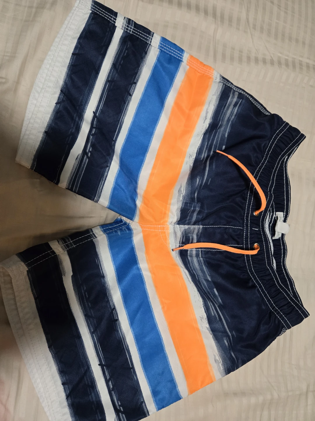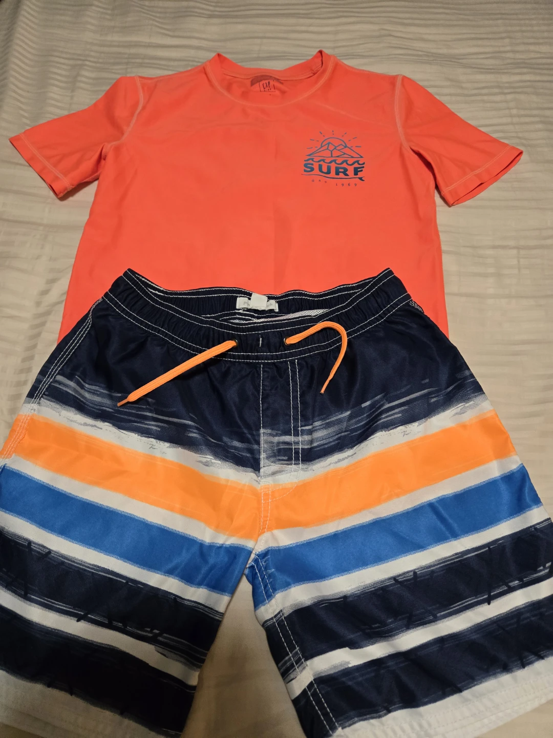 Selling a pair of Pumpkin Patch swim trunk & GAP swim top in size 9-10! The swim pant feature a vibrant striped pattern with blue, orange, and white. Perfect for a day at the beach or pool!