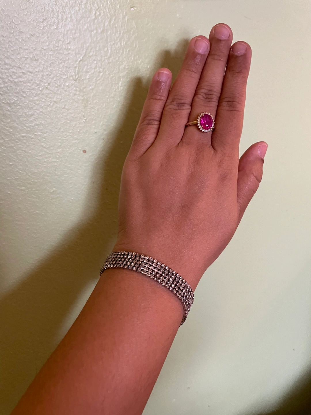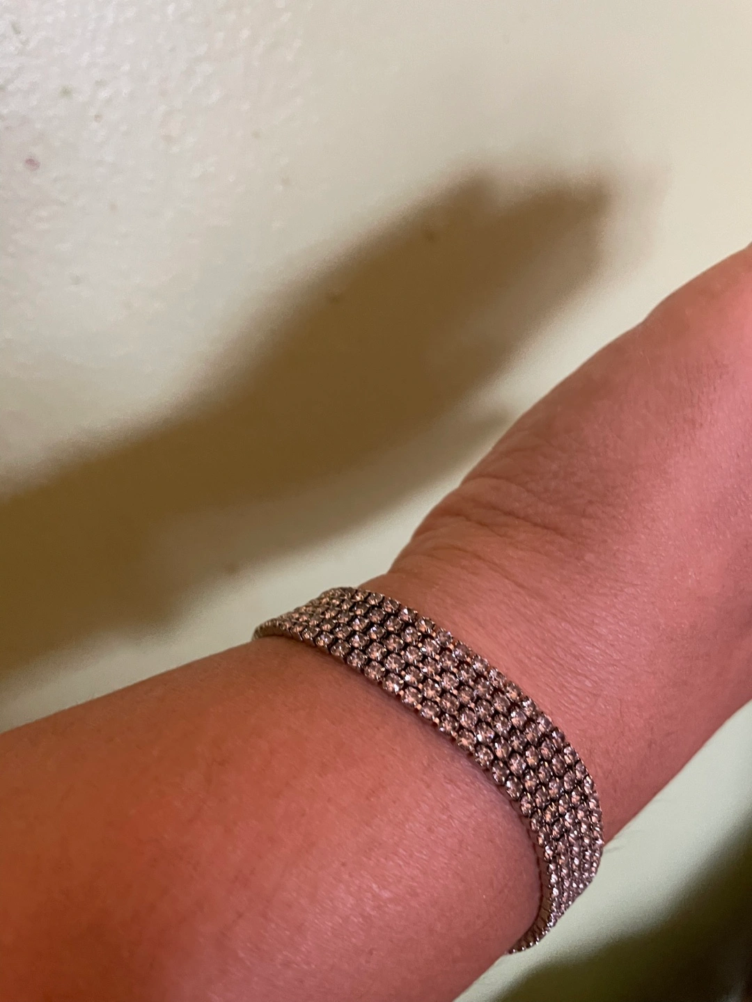 Five rows of clear crystals. Silver-toned metal clasp. Elegant and eye-catching. Perfect for adding a touch of glamour to any outfit.