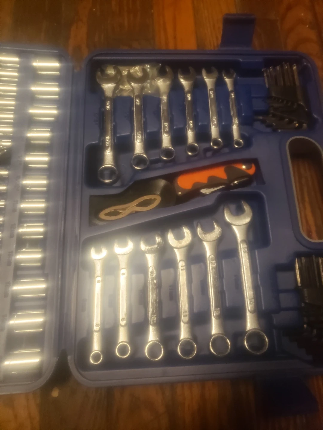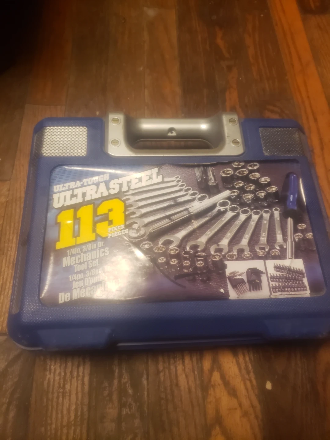 This is an Ultra-Tough 113-piece mechanics tool set. It includes a variety of sockets, wrenches, and a ratcheting screwdriver. Great for general repairs and maintenance!