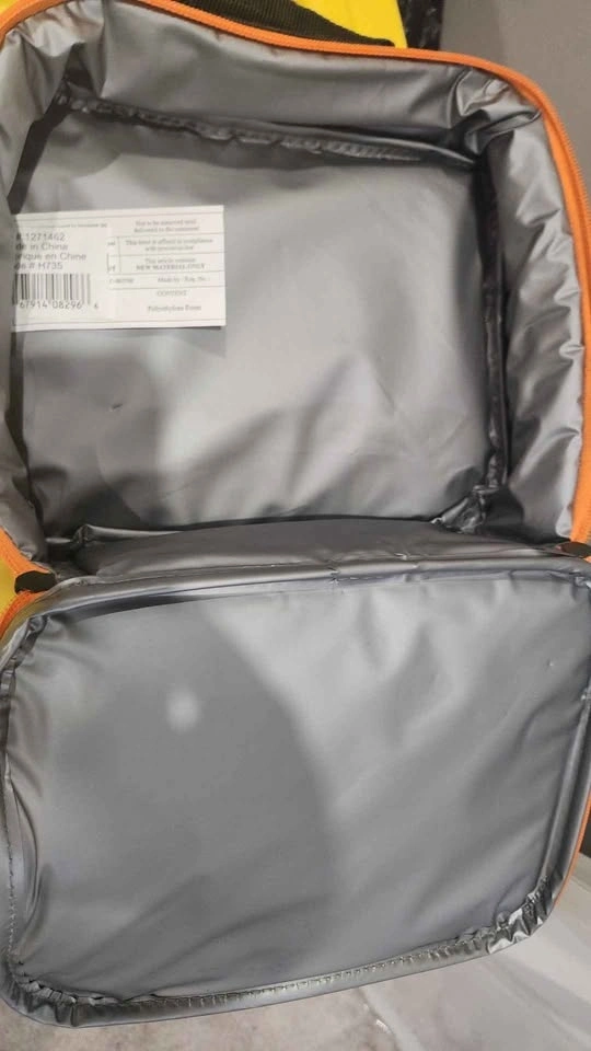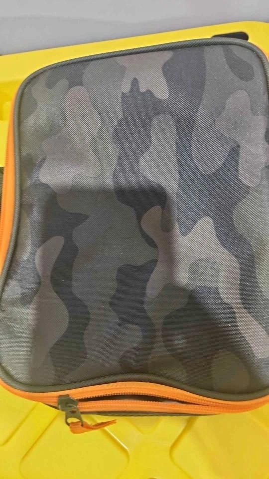 Insulated camo lunch bag with a cool gray and green camouflage design and a bright orange zipper. The interior is insulated, great for keeping food and drinks cool. Price: $5 CASH ONLY. Meet Location: Pickering.