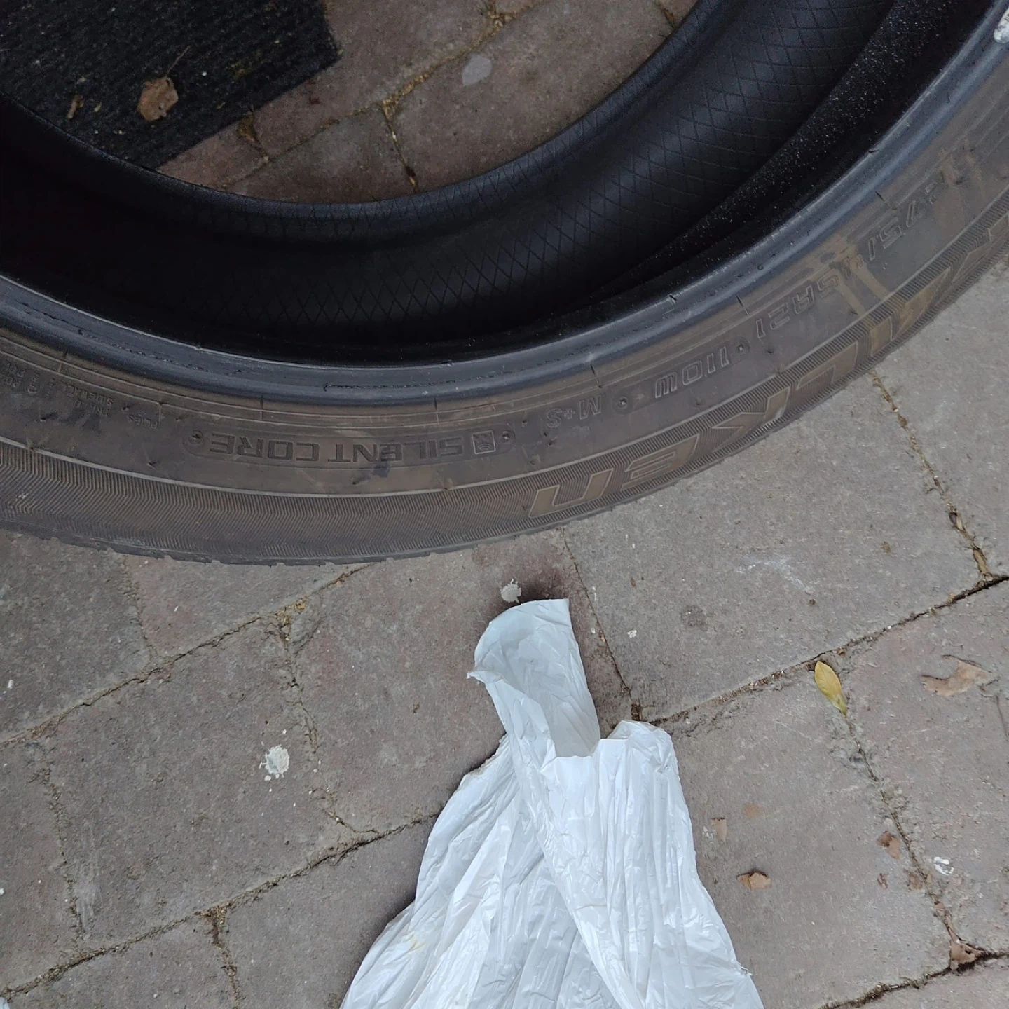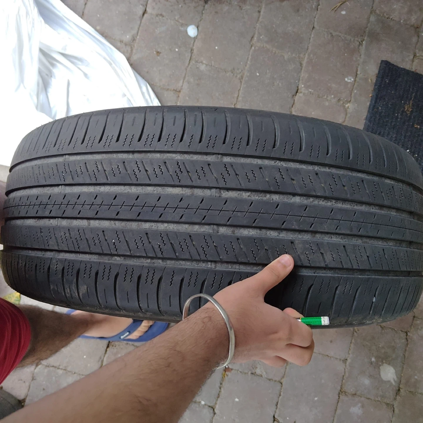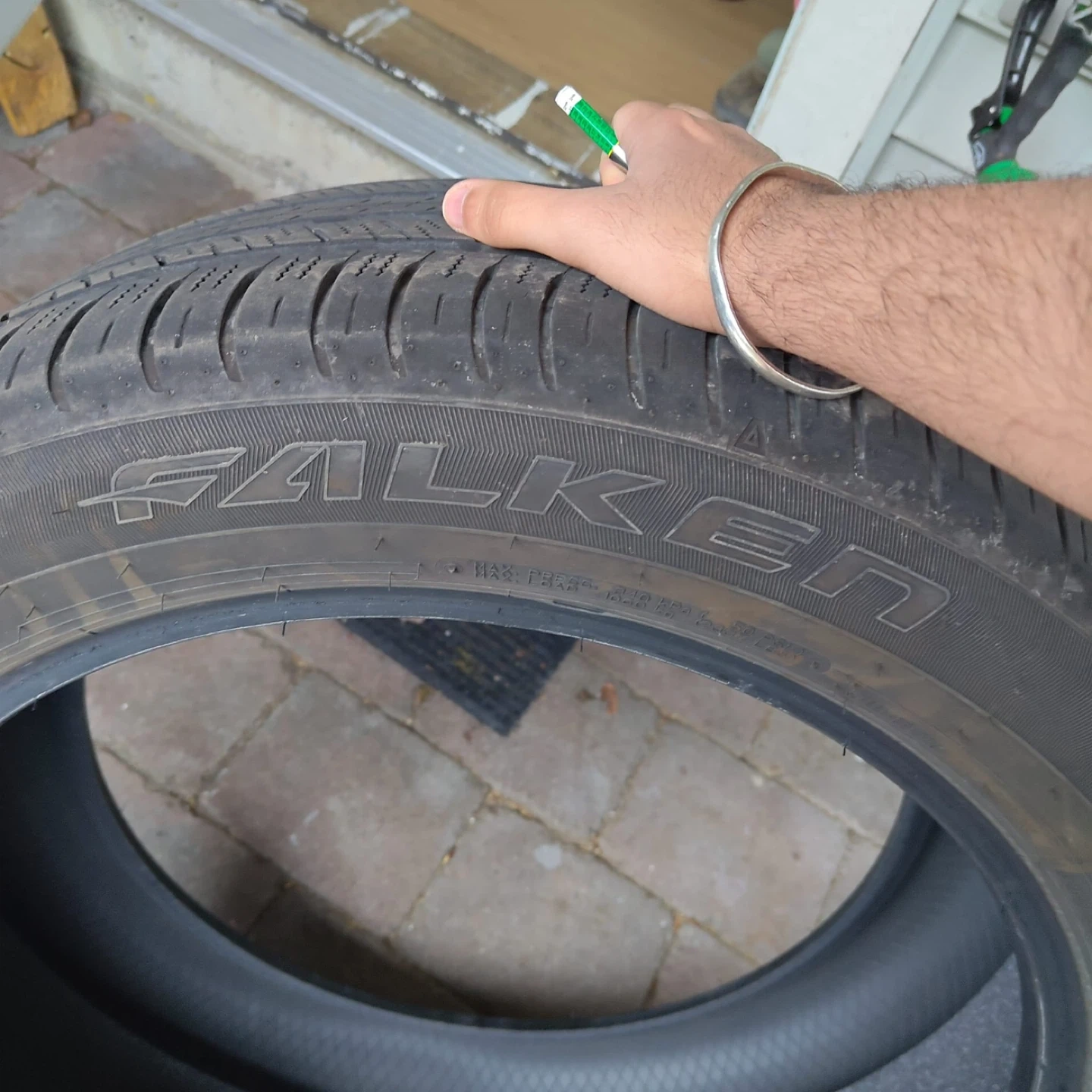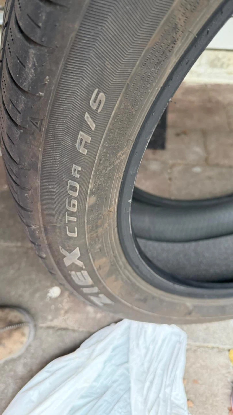 Falken CT60R A/S all-season tire. They are a full-size tire. The tread depth is approximately 8/32", as measured by the gauge shown. This would be useful for replacing a damaged spare or as a temporary replacement. Compatible with MazdaCX90 2025 model. You can even buy single if needed
