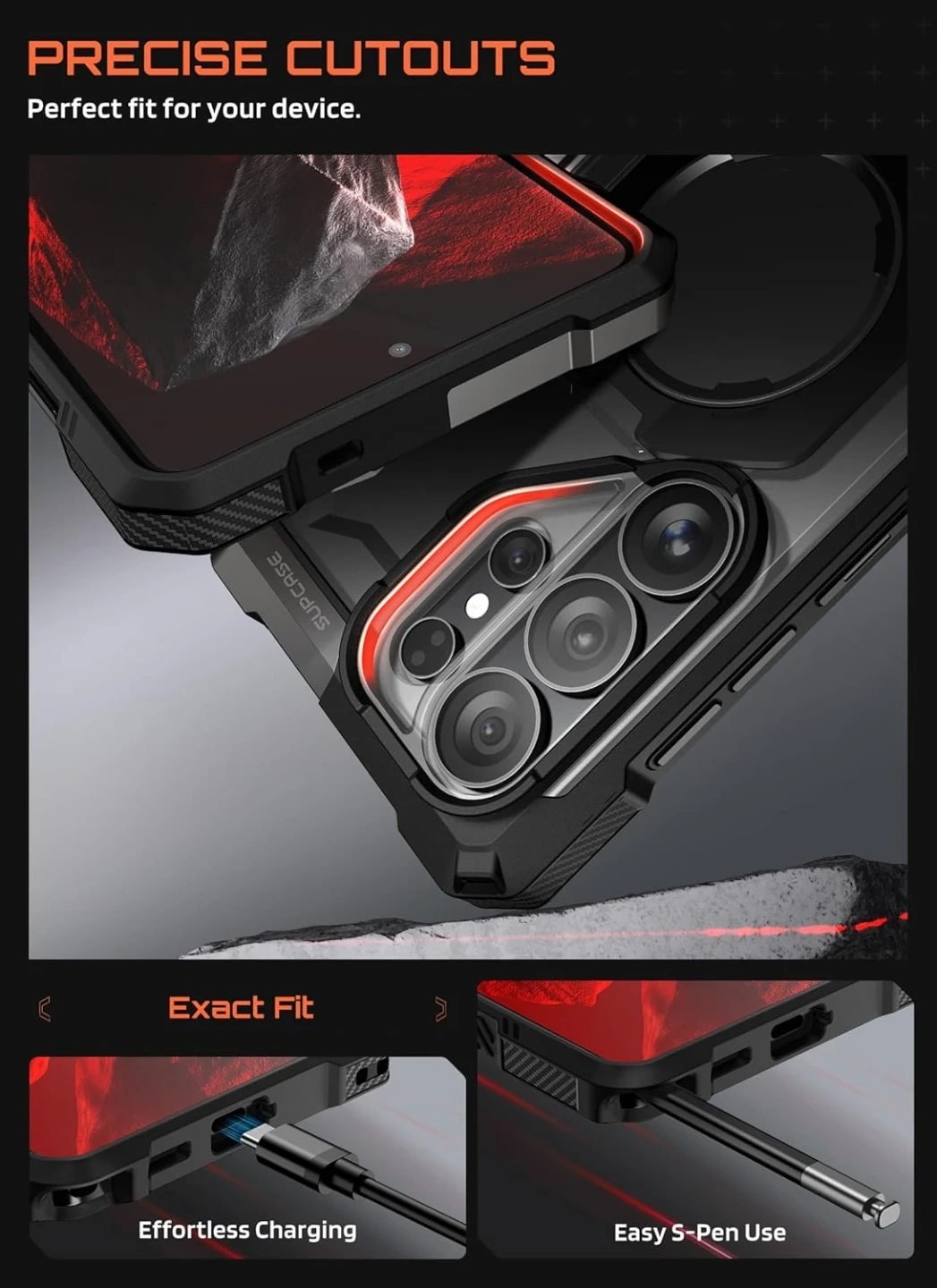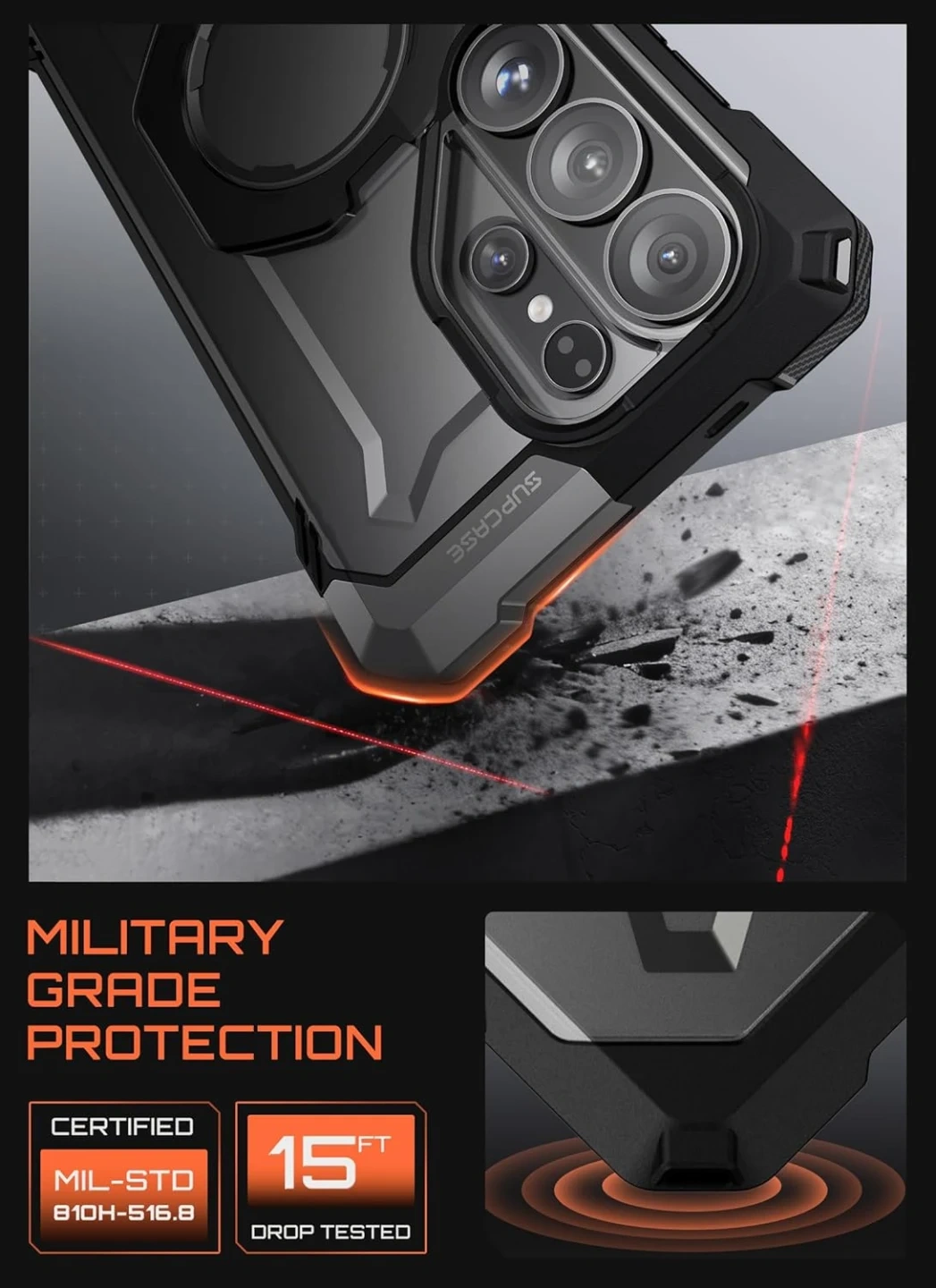 TPU + PC hard-shell structure with shock-absorbing edges. This Galaxy S26 Ultra case Equipped with corner airbag protection, tested up to 4.5 m (15 ft) for drop resistance and meeting MIL-STD-810H-516.8 standards. The camera cutout is raised by 1.5 mm, and the front frame is raised 2 mm above the screen.