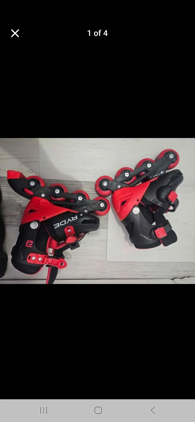 These RYDE inline skates are black and red. They have adjustable sizing marked Y8 to Y11. They're good for learning to skate!