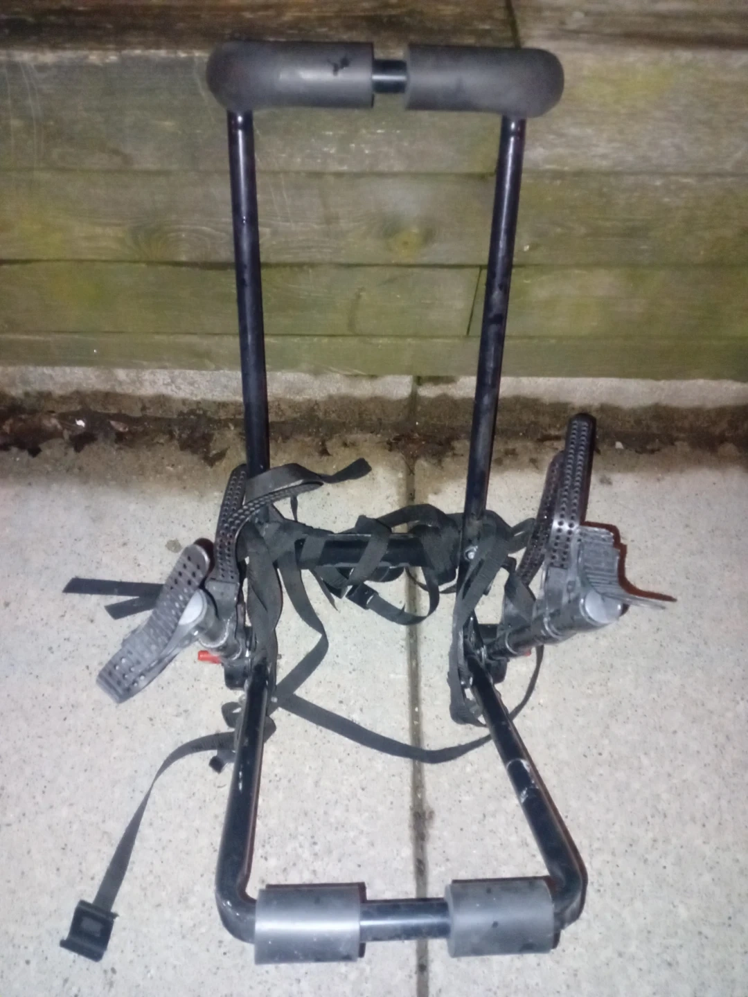 This is a trunk-mounted bike rack for carrying your bicycles. It features adjustable straps for securing the rack to your vehicle. The rack has padded supports to protect your bike frame.