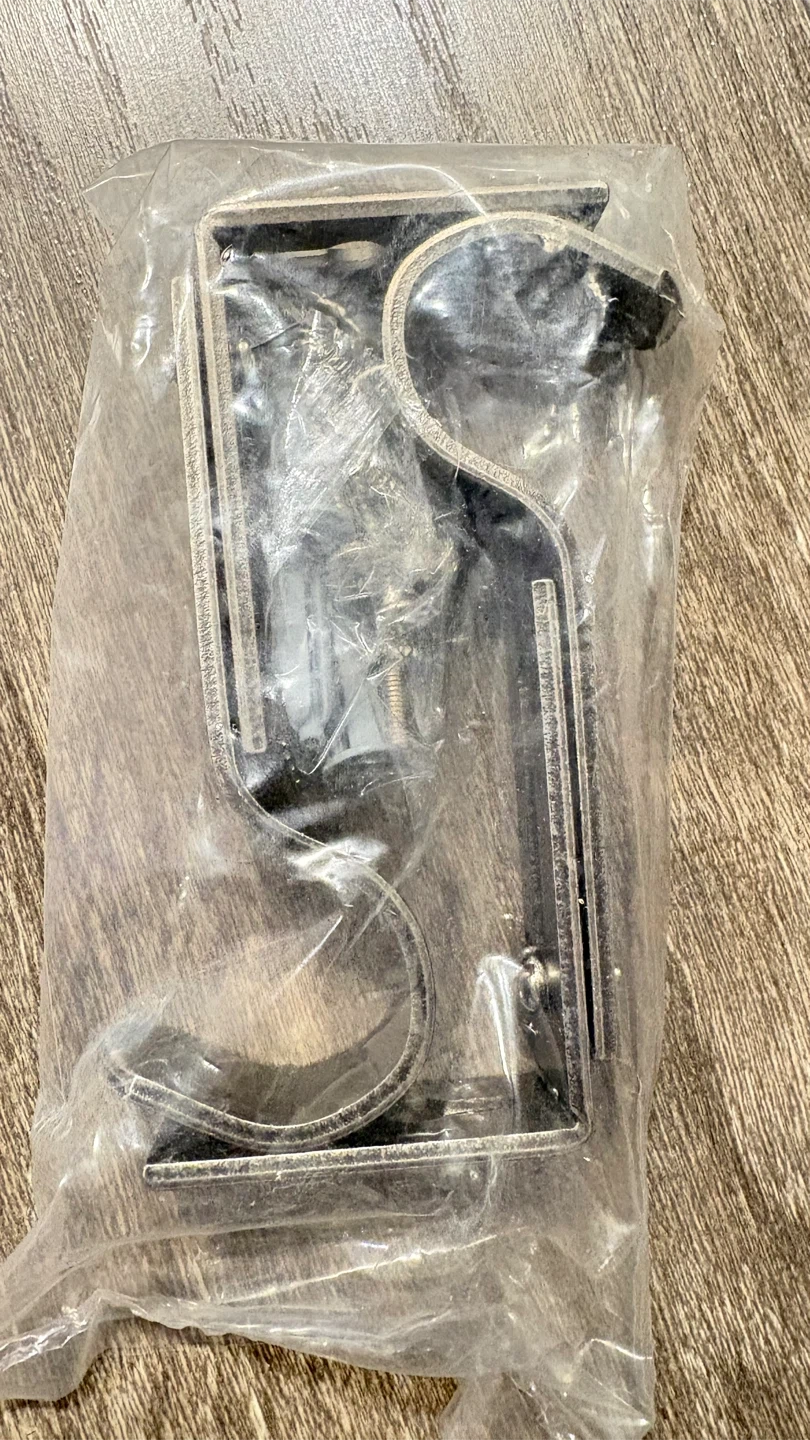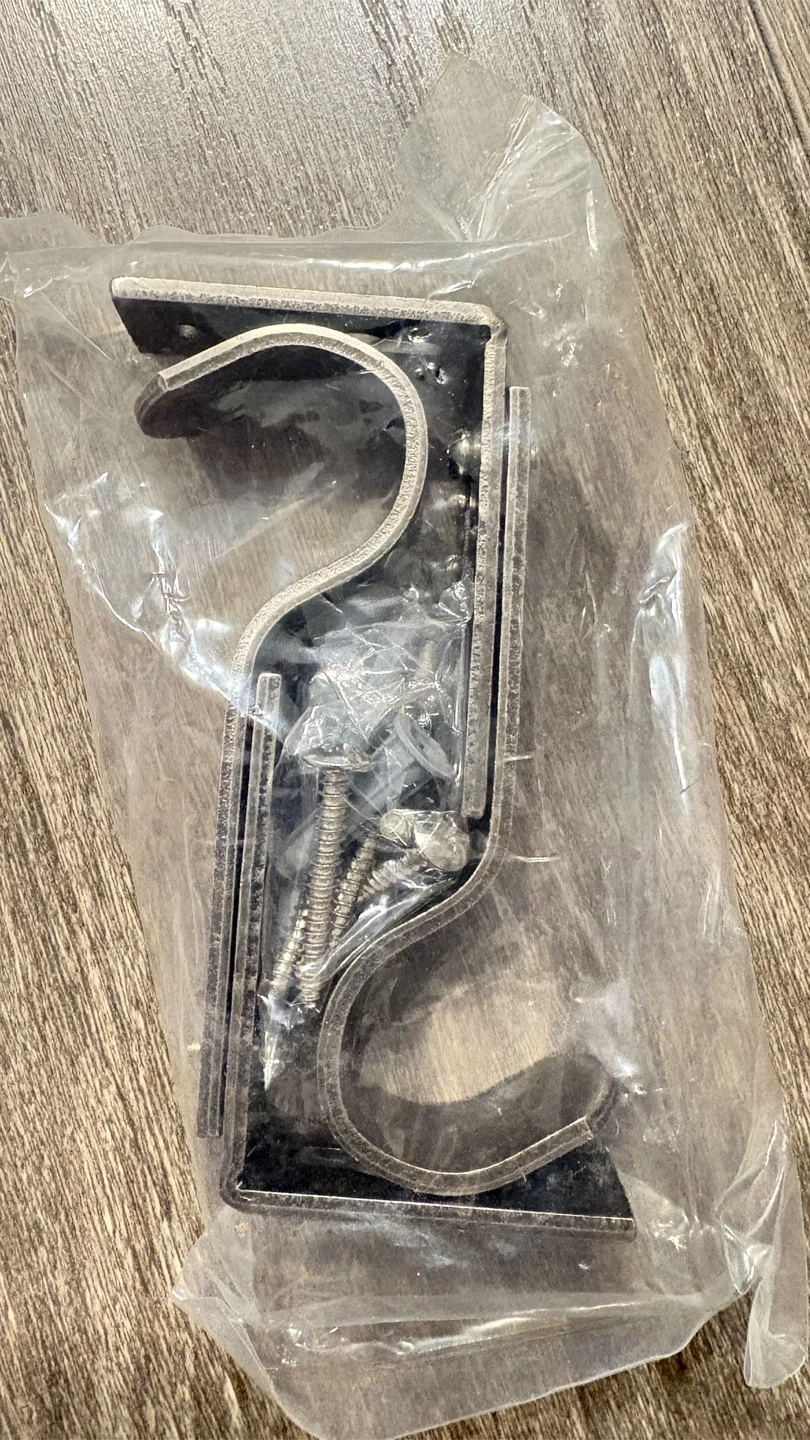 Set of two curtain rod brackets. Includes mounting screws. These brackets are finished in a dark, brushed metal. They're designed to hold a standard curtain rod.