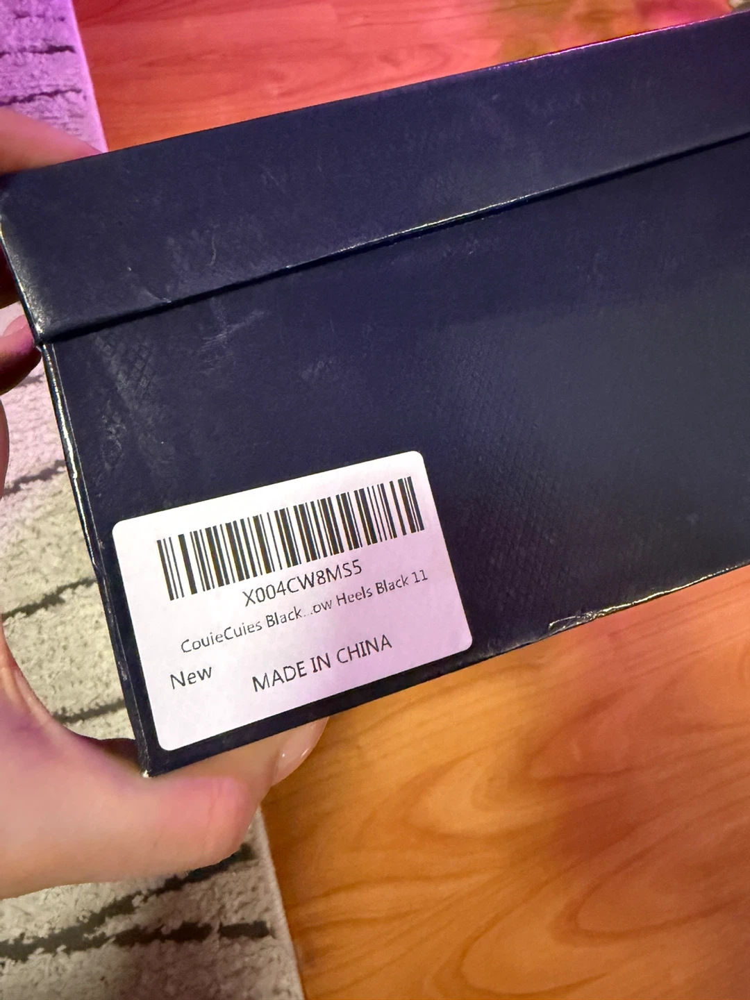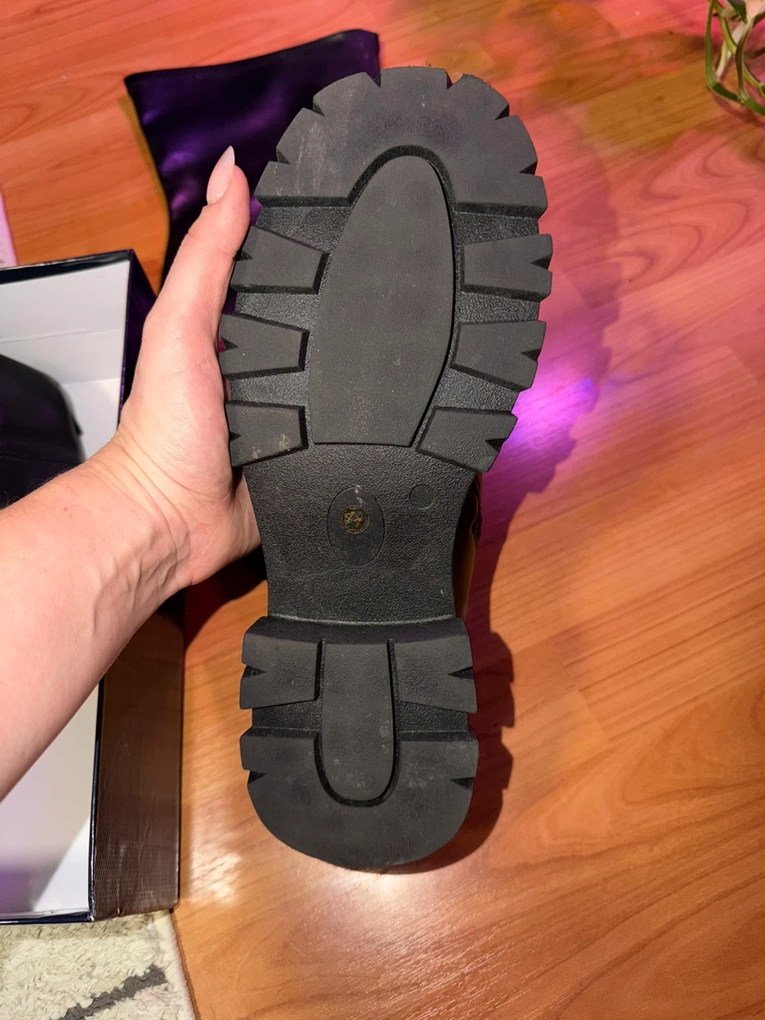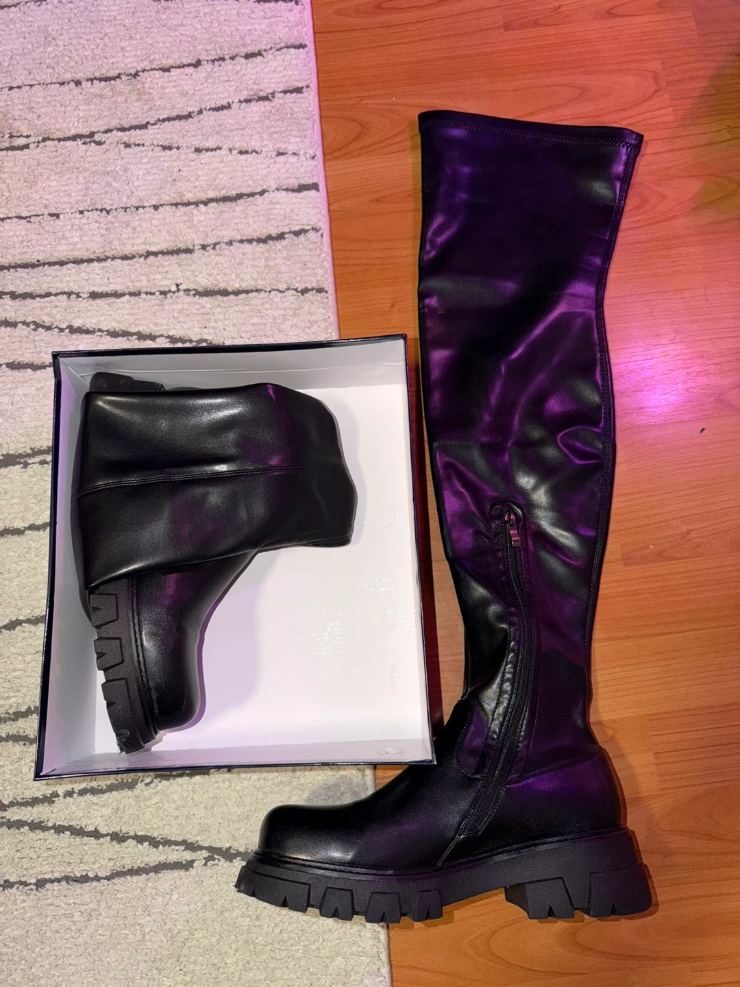 CouieCuies women's over-the-knee boots in black. They're size 11 and feature a chunky lug sole. Material appears to be faux leather. Includes original box. Very comfortable! Worn once for a costume.