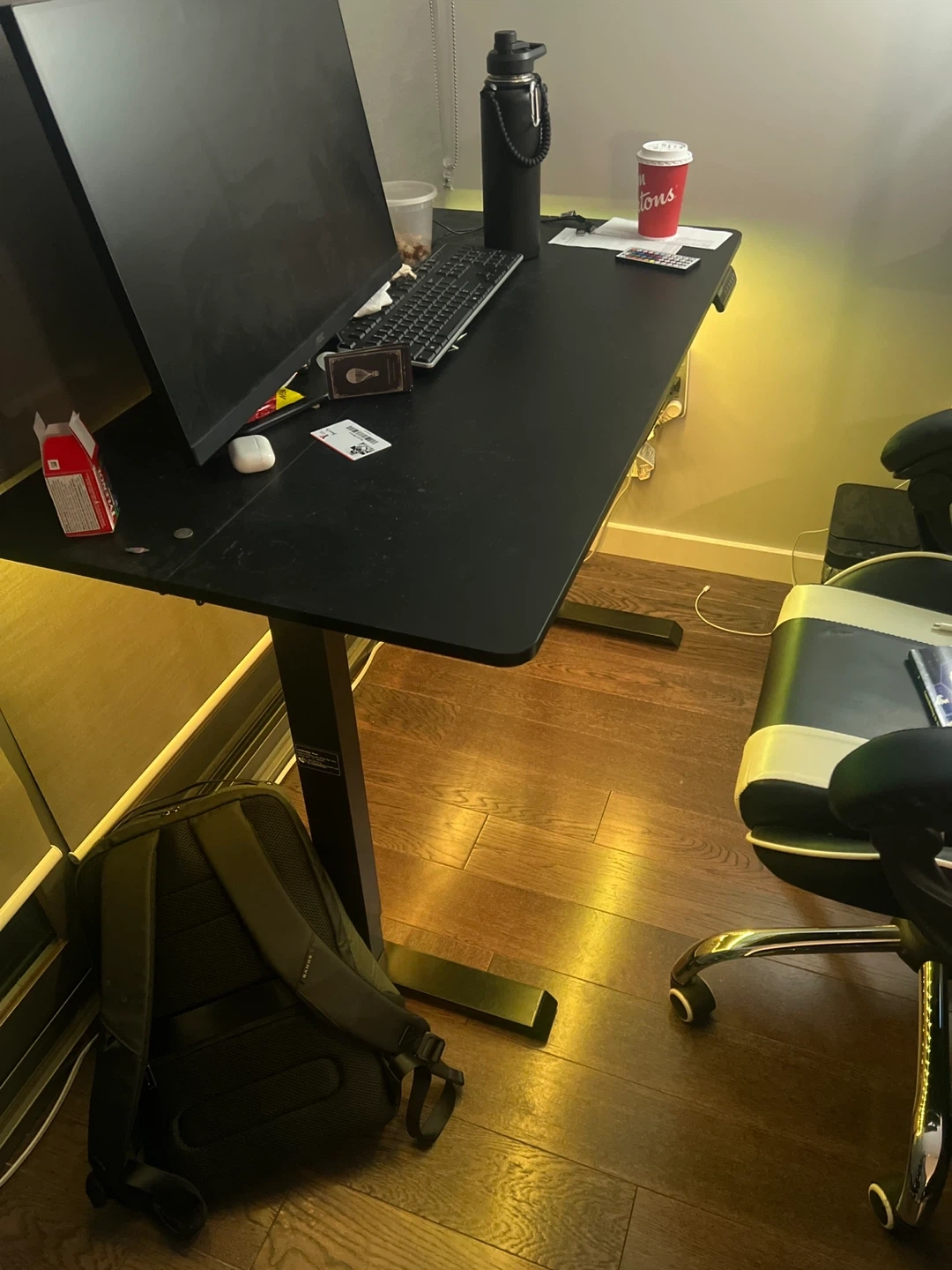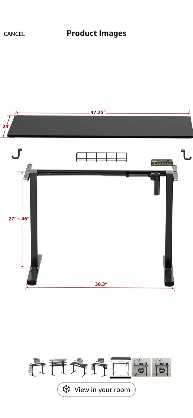 Selling a black adjustable standing desk. The dimensions are 47.25 inches by 24 inches. Great for a home office or gaming setup!