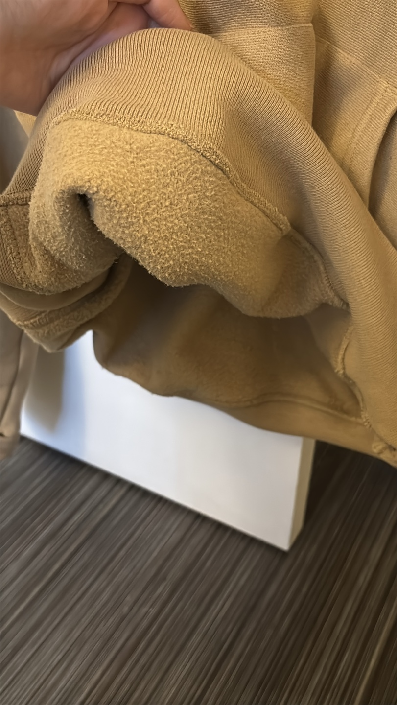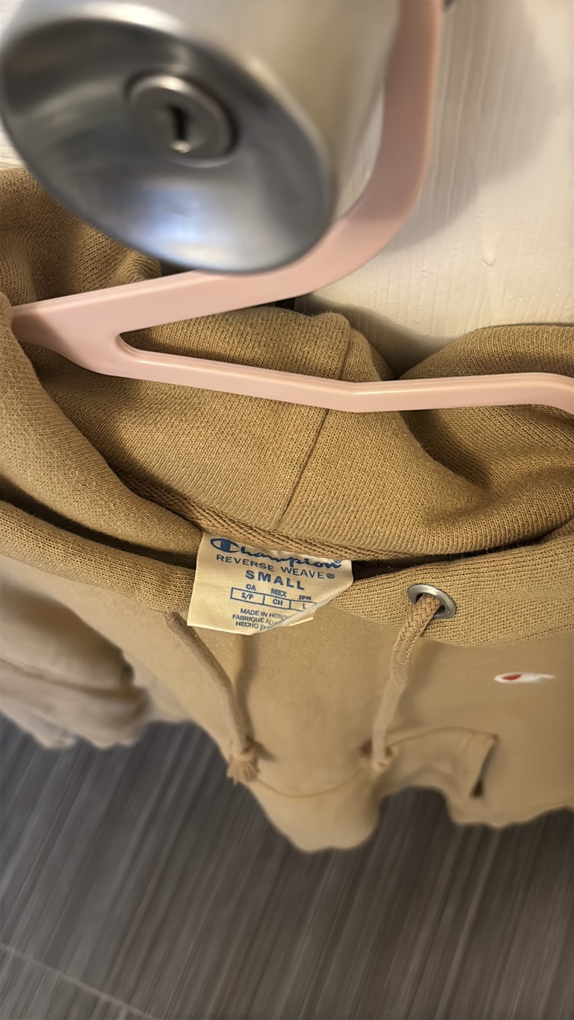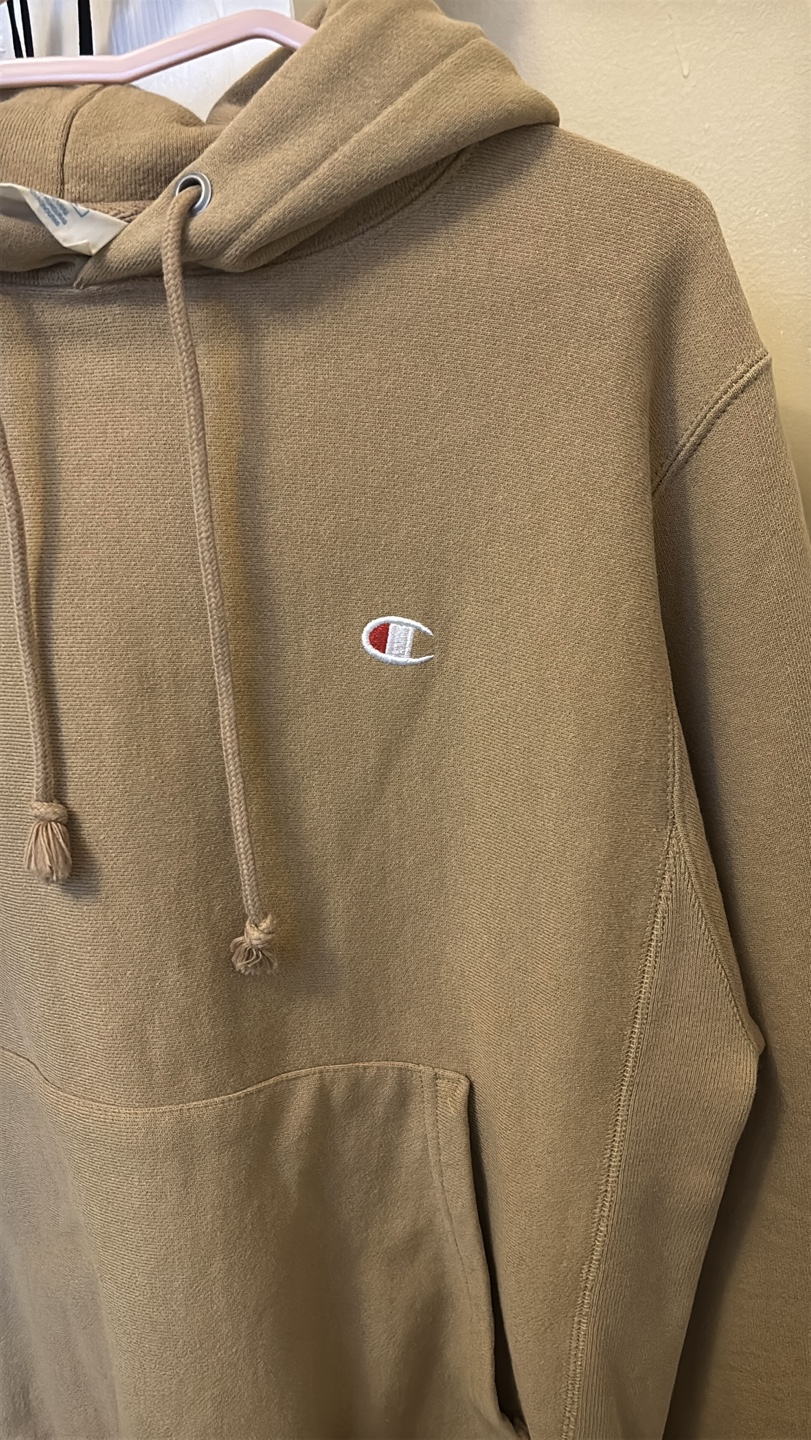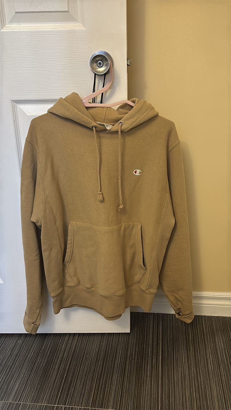 Tan Champion Reverse Weave hoodie. Small size for men, medium size for women. Features a kangaroo pocket and drawstring hood. Warm fabric inside.