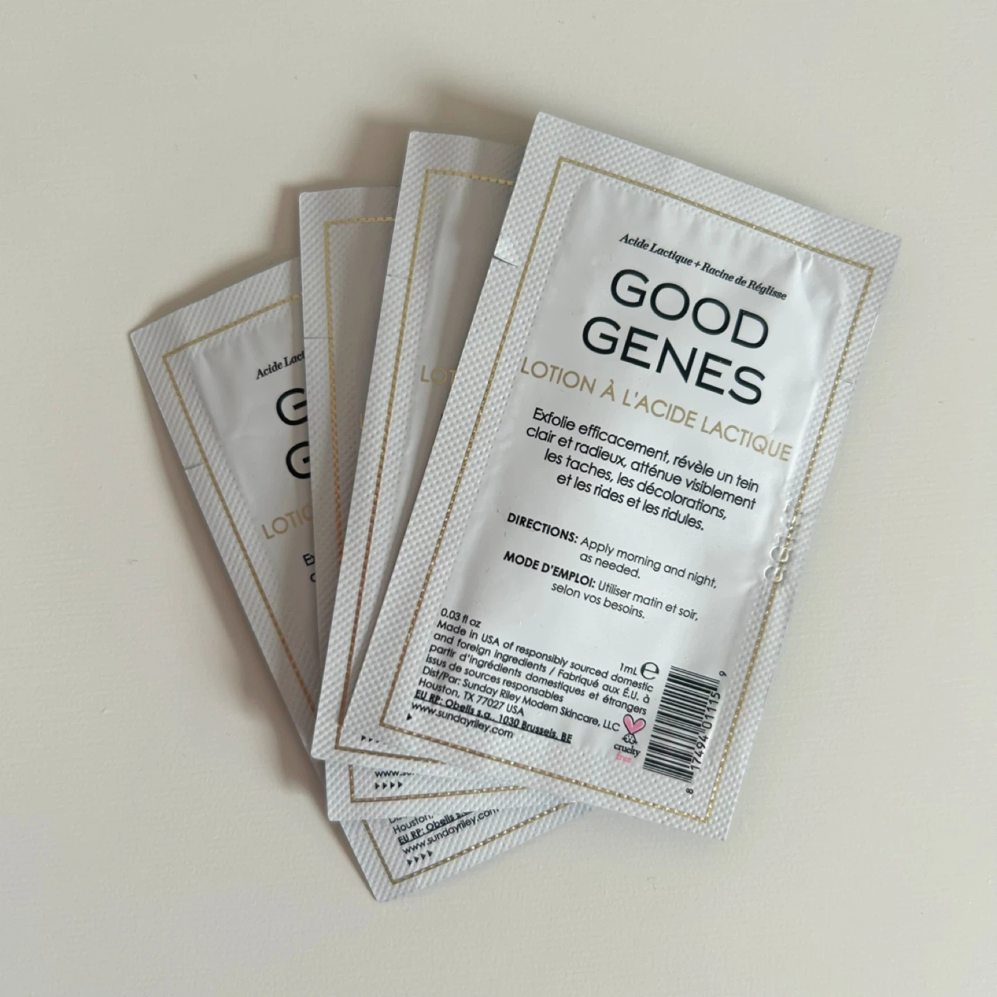 Four packets of Sunday Riley Good Genes Lactic Acid Treatment. Each packet contains 1ml of product. It deeply exfoliates for a clear and radiant complexion, visibly brightens dark spots and discolourations, and instantly plumps the look of fine lines and wrinkles. Apply morning and night as needed. Made in the USA. Lactic Acid + Licorice Root.
