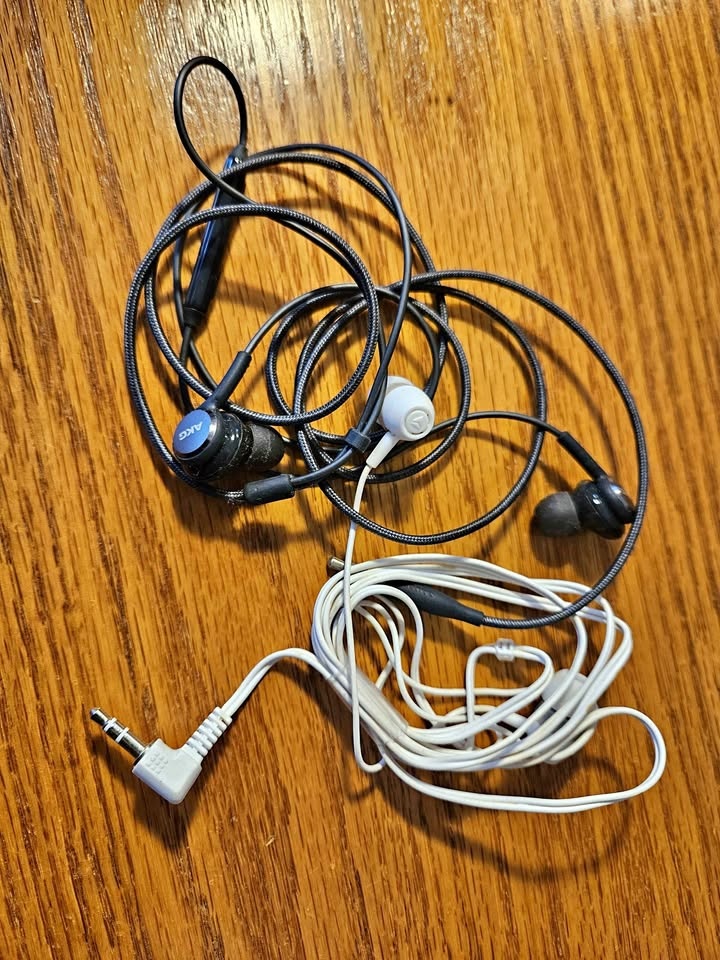 Handy set of wired earbuds up for grabs! Got a black AKG pair with braided cable and another white one with a right-angle jack. Good for listening to music or podcasts on the go.