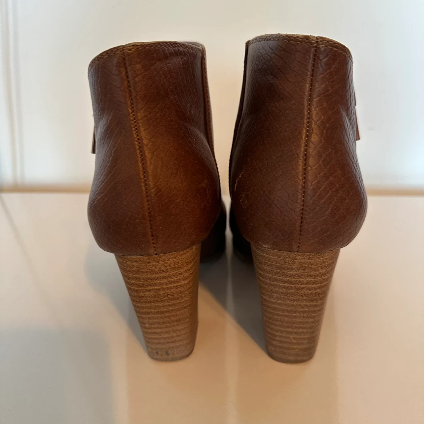 These stylish brown ankle boots have a faux leather finish with a subtle snake-print texture on the back panel. They feature a convenient side zipper and a sturdy wooden-look block heel. A great choice for adding a bit of flair to your everyday outfits!