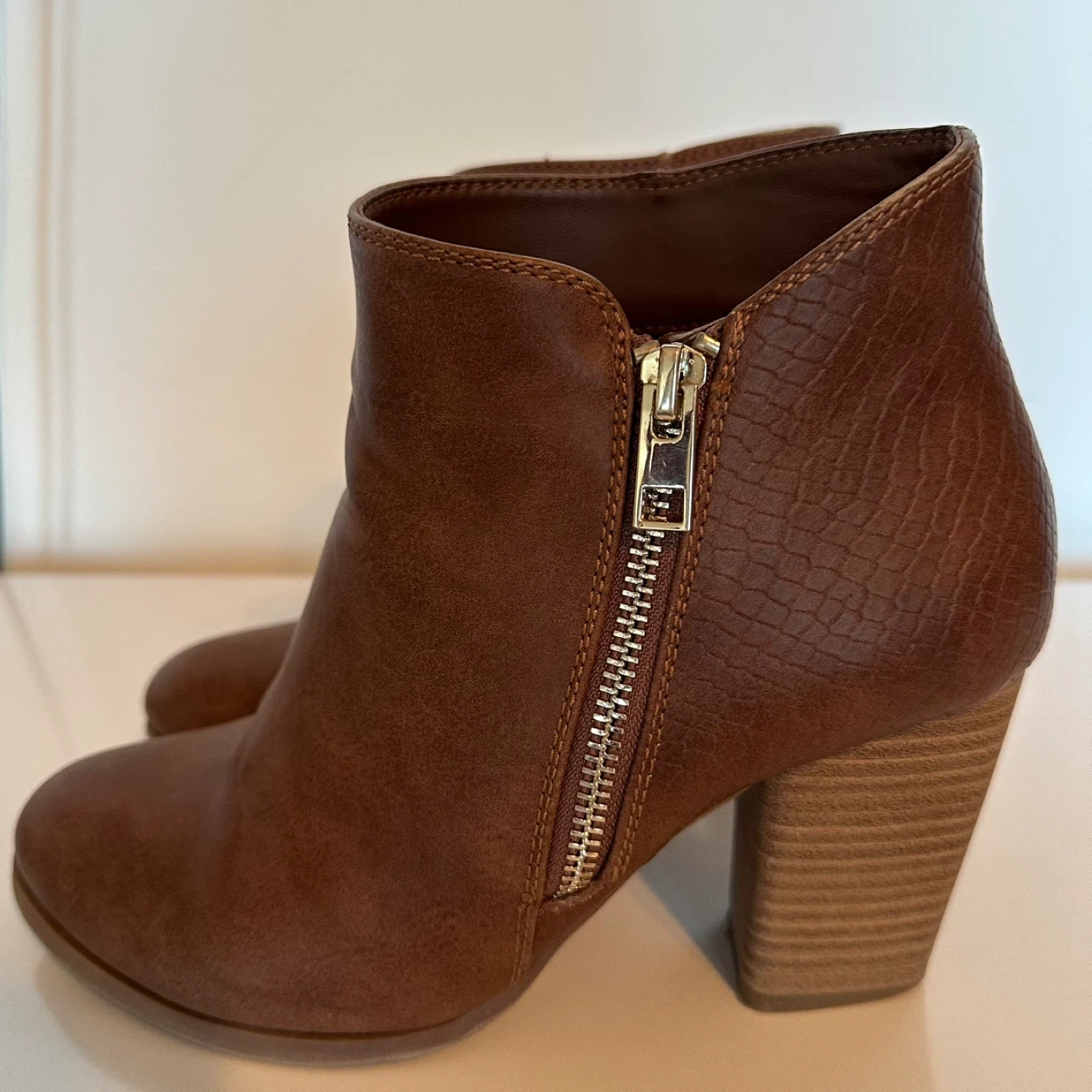 These stylish brown ankle boots have a faux leather finish with a subtle snake-print texture on the back panel. They feature a convenient side zipper and a sturdy wooden-look block heel. A great choice for adding a bit of flair to your everyday outfits!