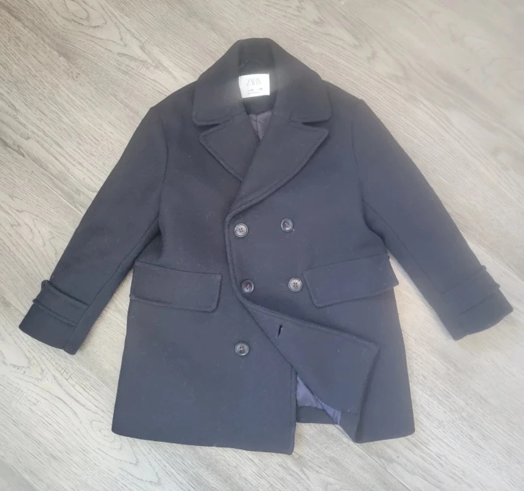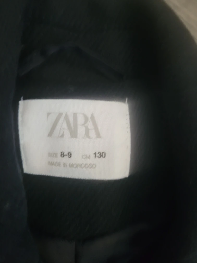 This Zara boys' coat is a stylish double-breasted design. It's made with a wool blend and features a size tag indicating 8-9 years, or 130 cm. This coat is suitable for cooler weather and is in fantastic like new condition.