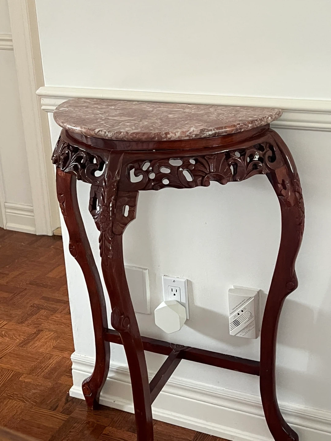 A beautiful antique console table featuring a pinkish-red marble top. The dark wooden base is intricately carved with floral details and ornate legs. It's a lovely accent piece for an entryway or living room.