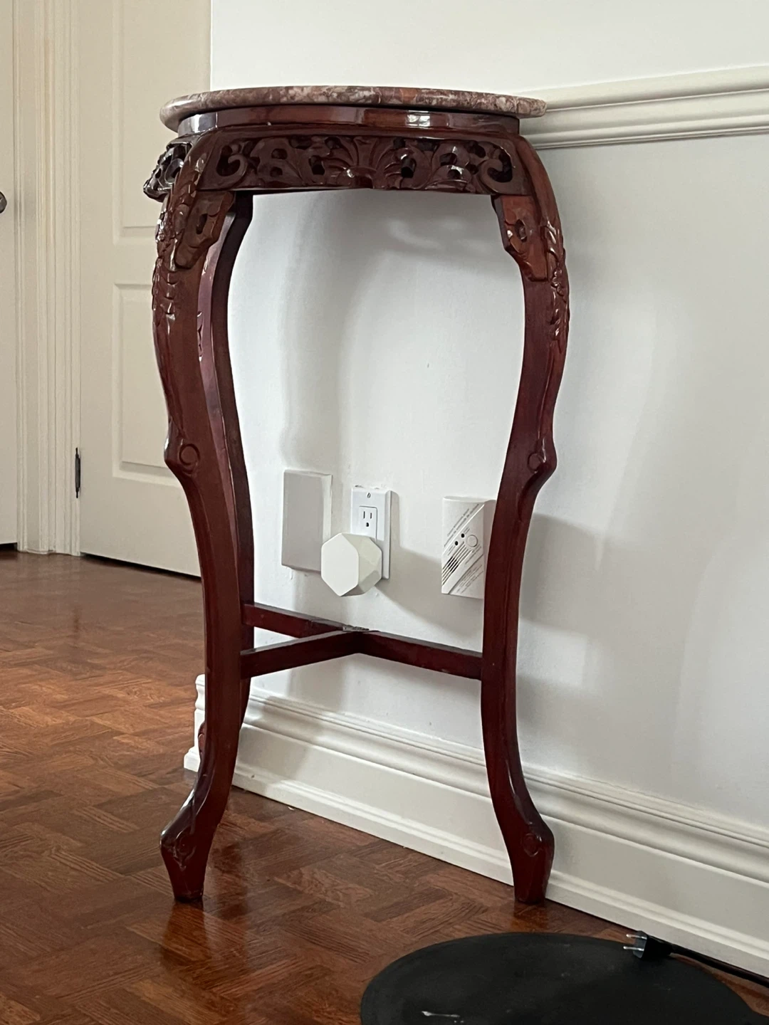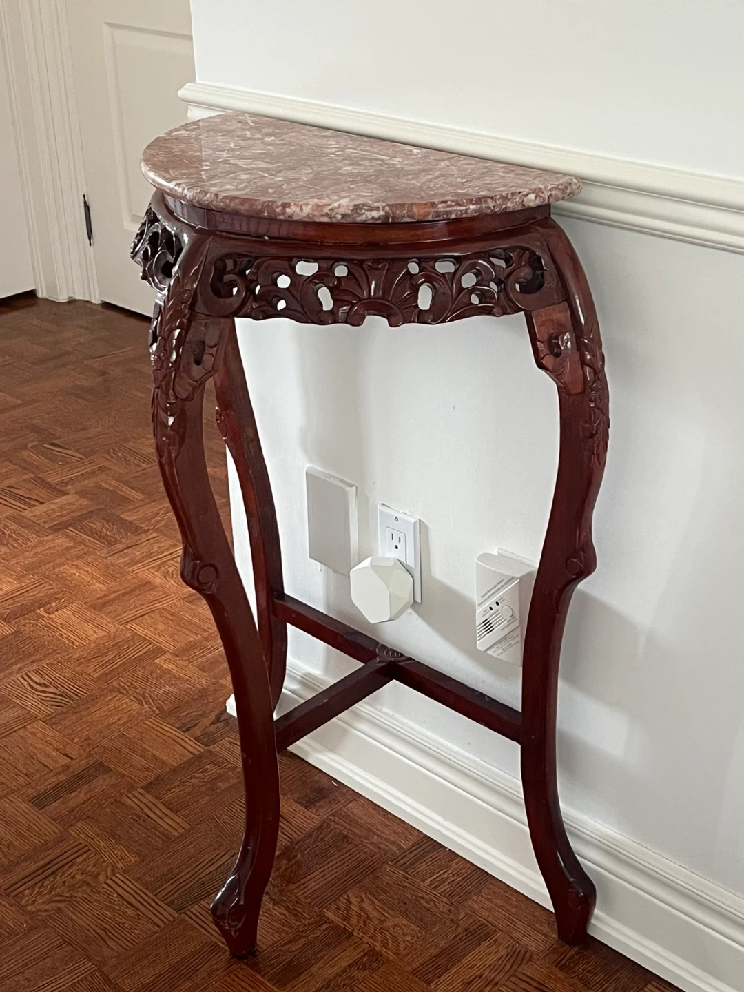 A beautiful antique console table featuring a pinkish-red marble top. The dark wooden base is intricately carved with floral details and ornate legs. It's a lovely accent piece for an entryway or living room.
