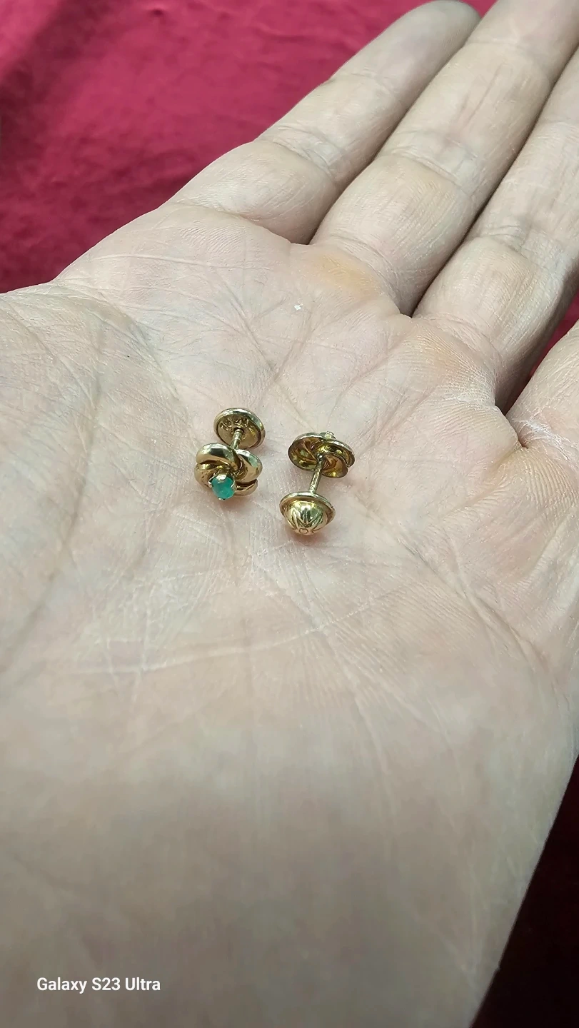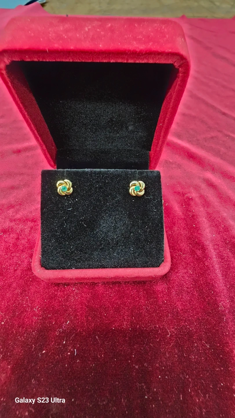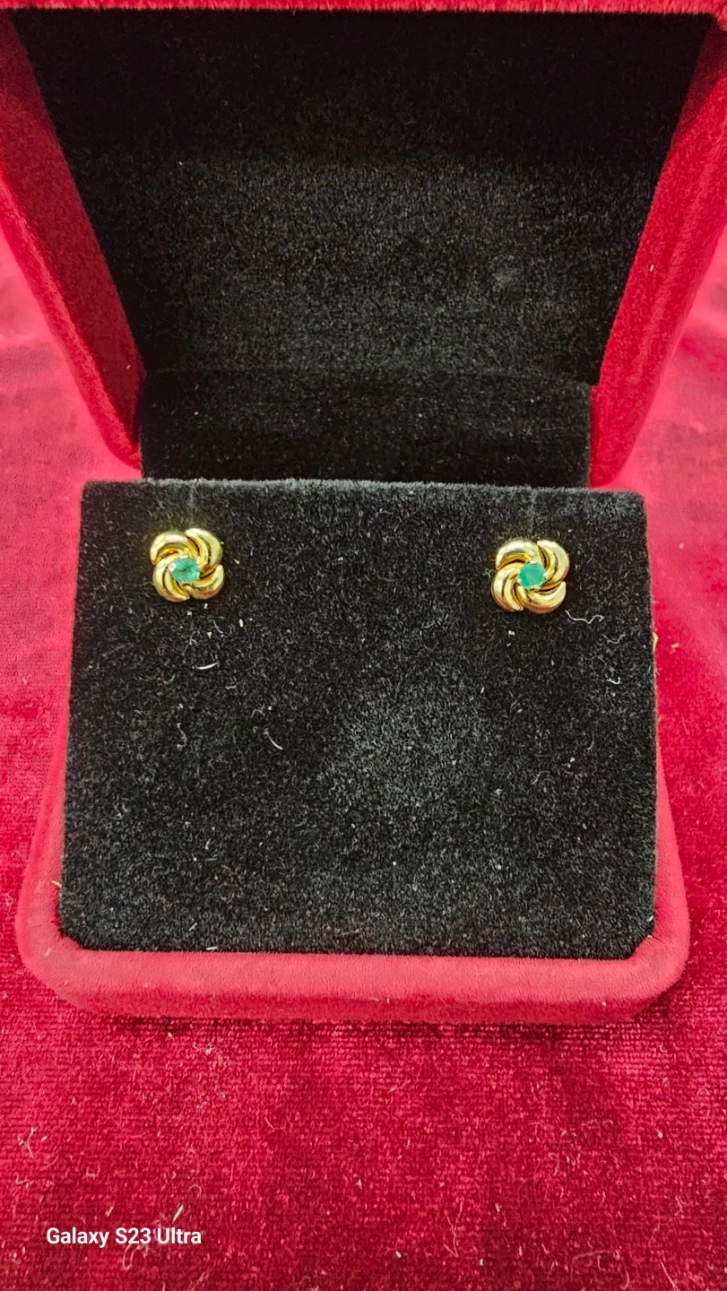 Selling a pair of gold 14 k flower stud earrings. They have a small emerald in the center of each flower. The earrings come with a red box.