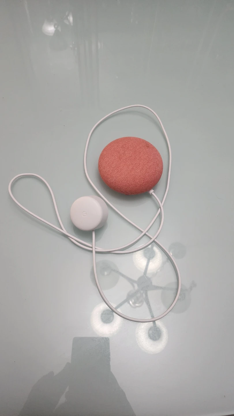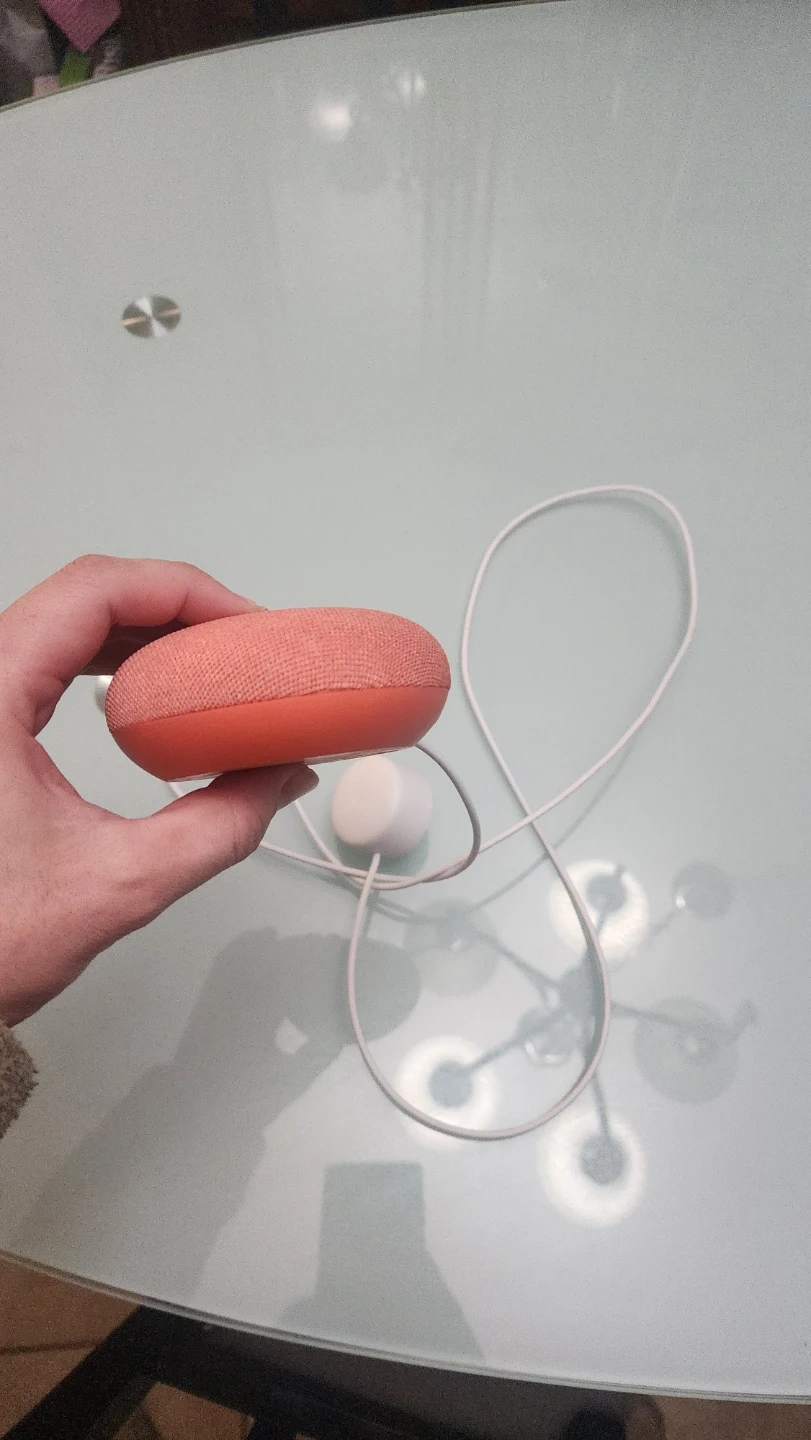This is a Google Nest Mini smart speaker in the coral colour. It's powered by a micro USB cable and power adapter. Voice control your music and smart home!