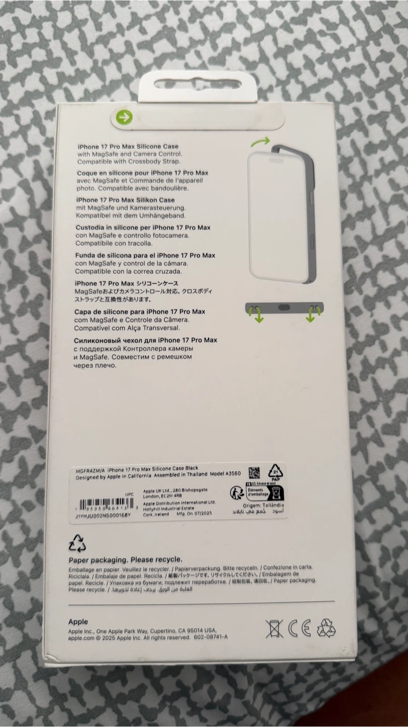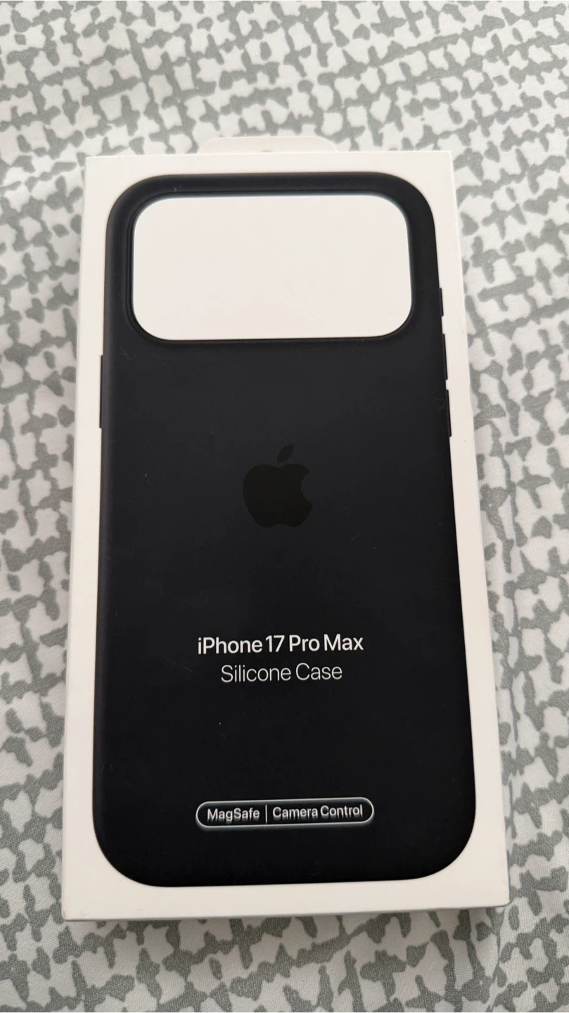 This is an Apple iPhone 17 Pro Max Silicone Case in black. It supports MagSafe and Camera Control. Silicone material.