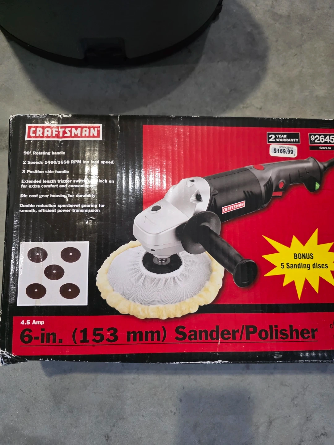 This is a 4.5 Amp, 6-inch (153 mm) Craftsman sander/polisher. It's got 2 speeds at 1400/1650 RPM and a 90° rotating handle. Includes a bonus of 5 sanding discs! Brand new in box.