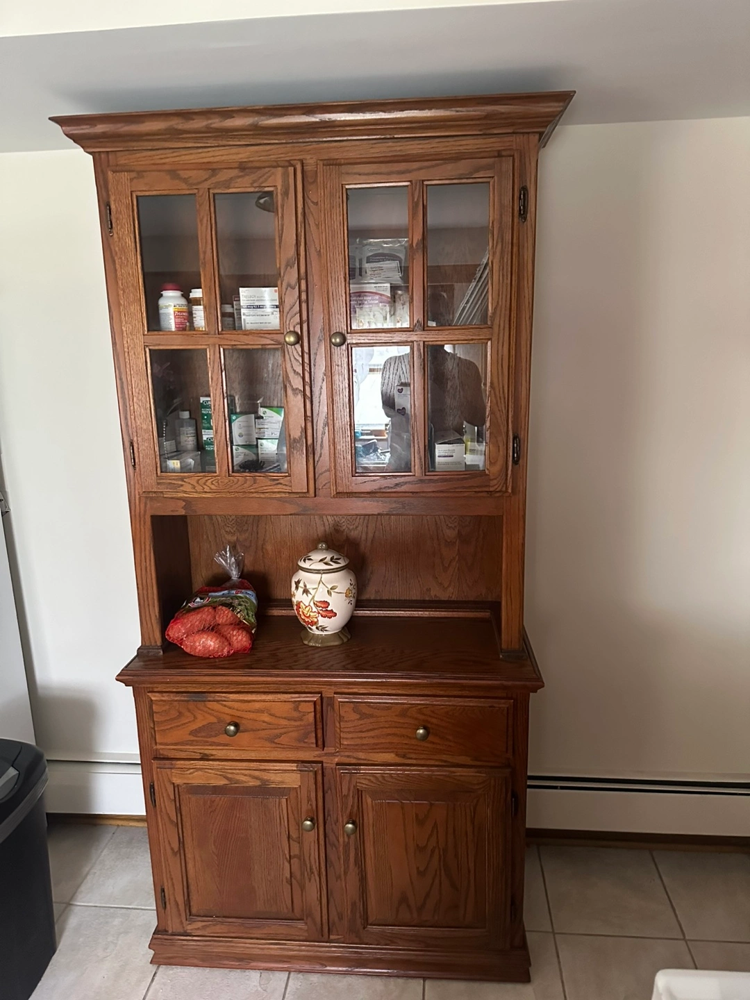 Oak hutch features glass doors, two drawers, and two cabinet doors. Perfect for displaying dishes or storing items. Good condition.