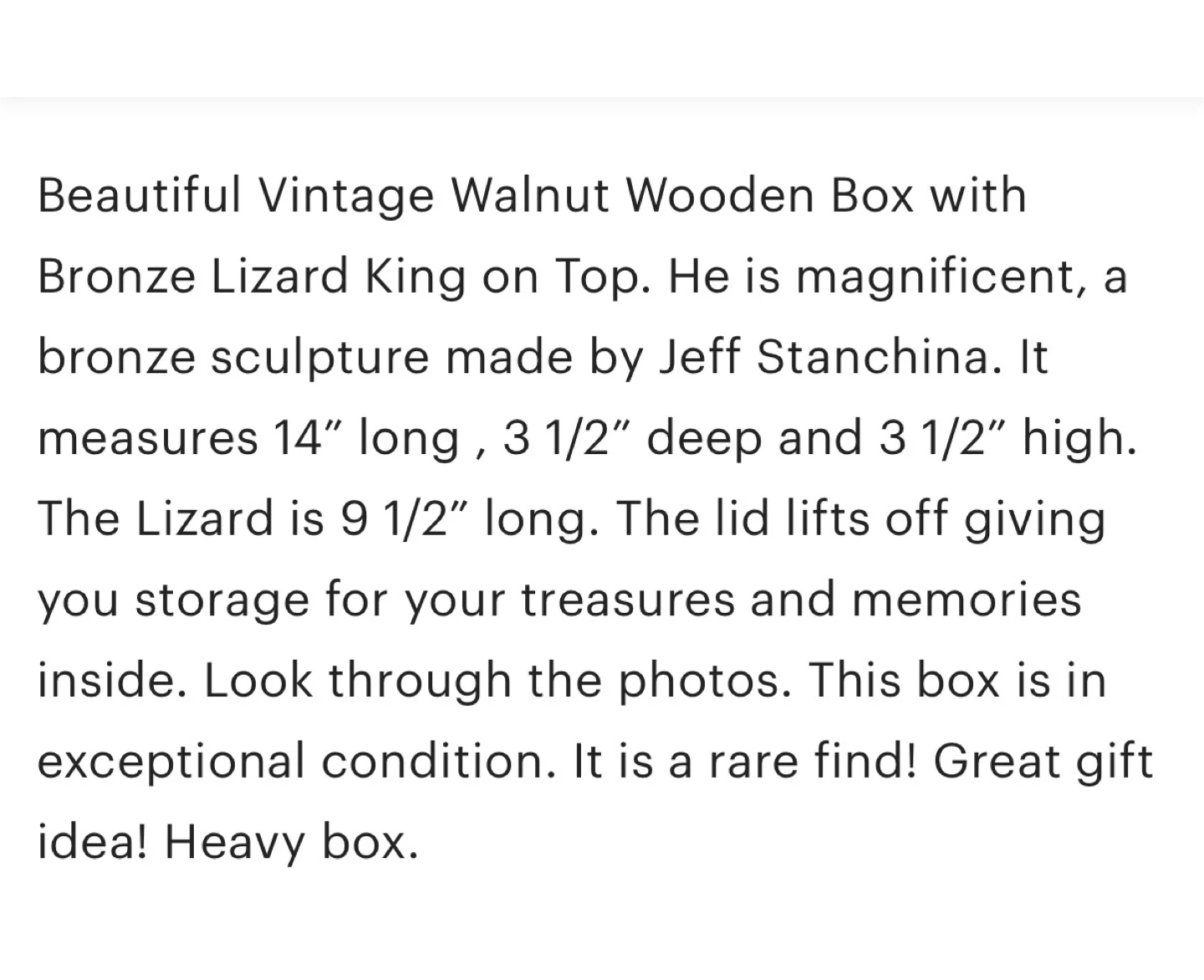 Vintage walnut wooden lid with a bronze lizard sculpture by Jeff Stanchina on top. The lid measures 14" long and The lizard sculpture itself is 9 1/2" long. It's a heavy wooden lid that is off a storage box