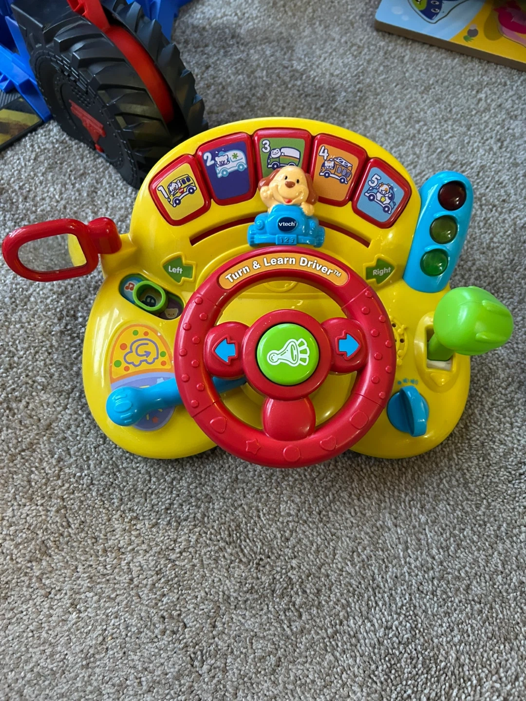 This VTech Turn & Learn Driver toy features a steering wheel and interactive buttons for little ones. It's yellow and red with a blue dog character. The toy includes traffic lights and a gear shift.