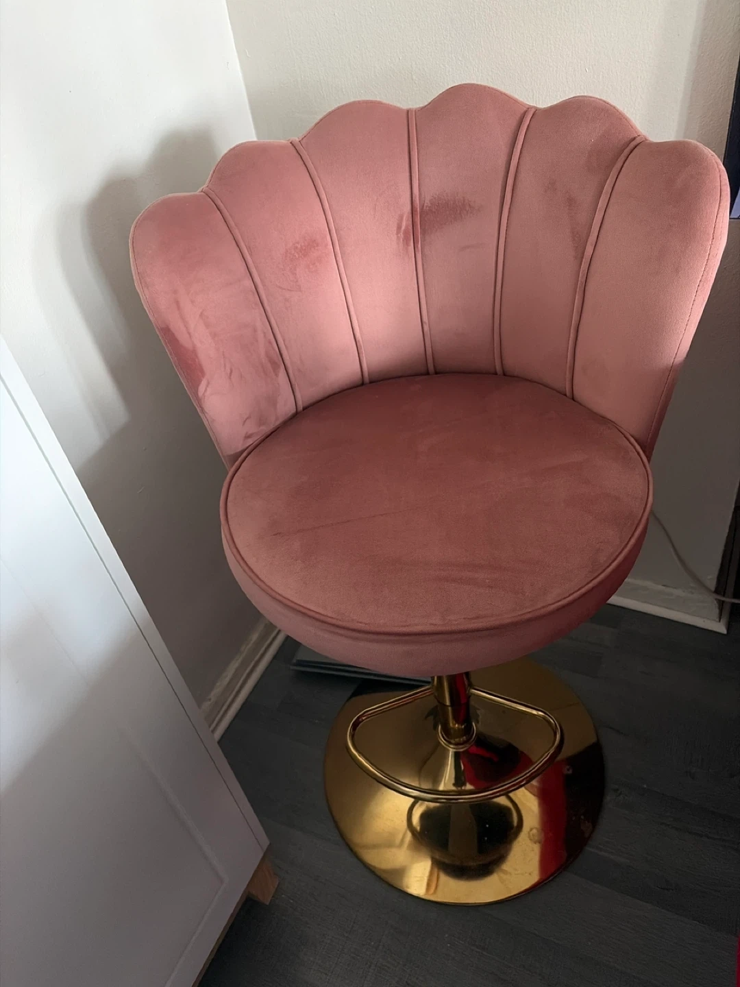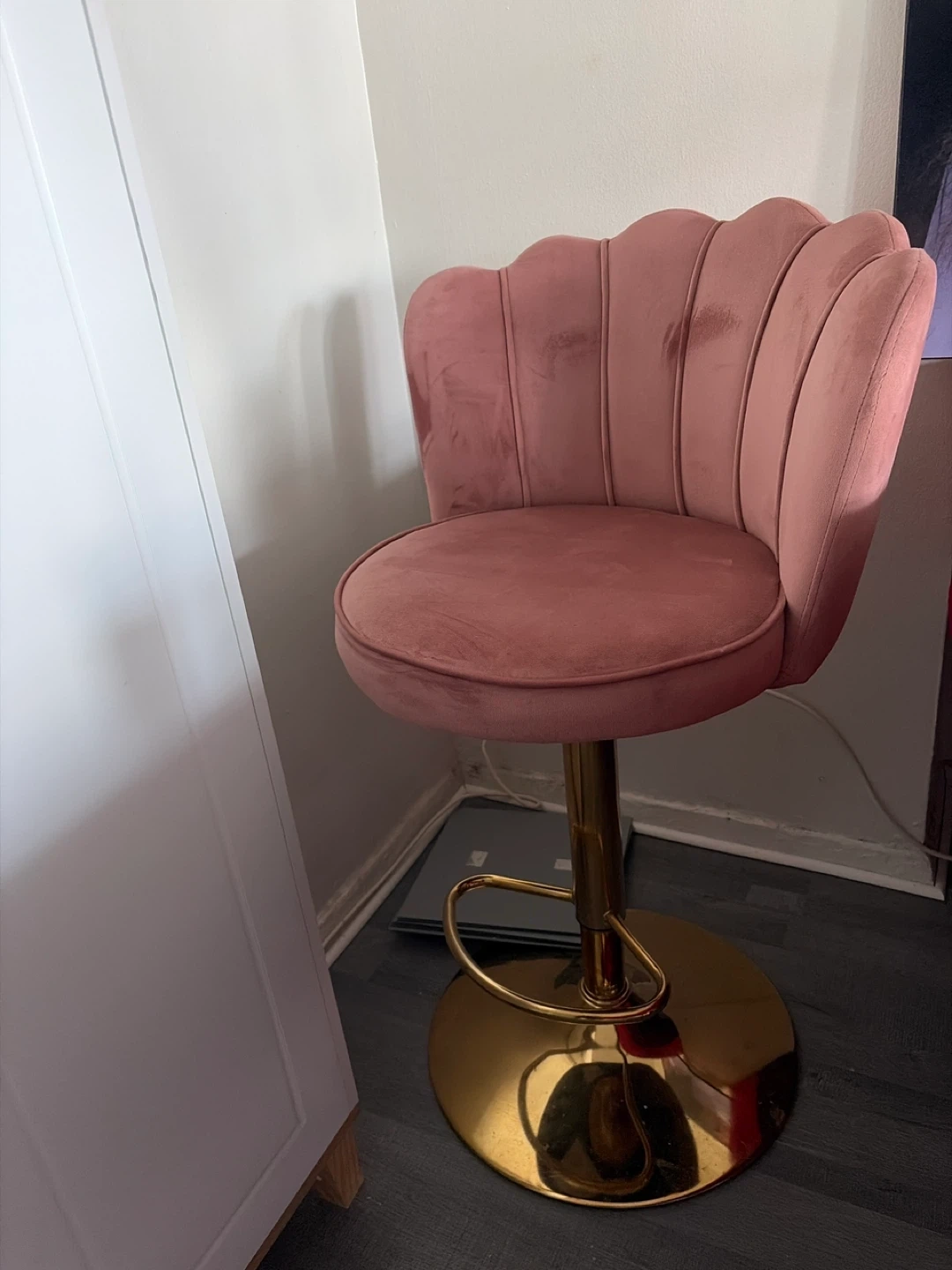 Selling a cute pink velvet swivel bar stool! It has a gold base and would look great in any kitchen or bar area. It's in good condition and ready for a new home!