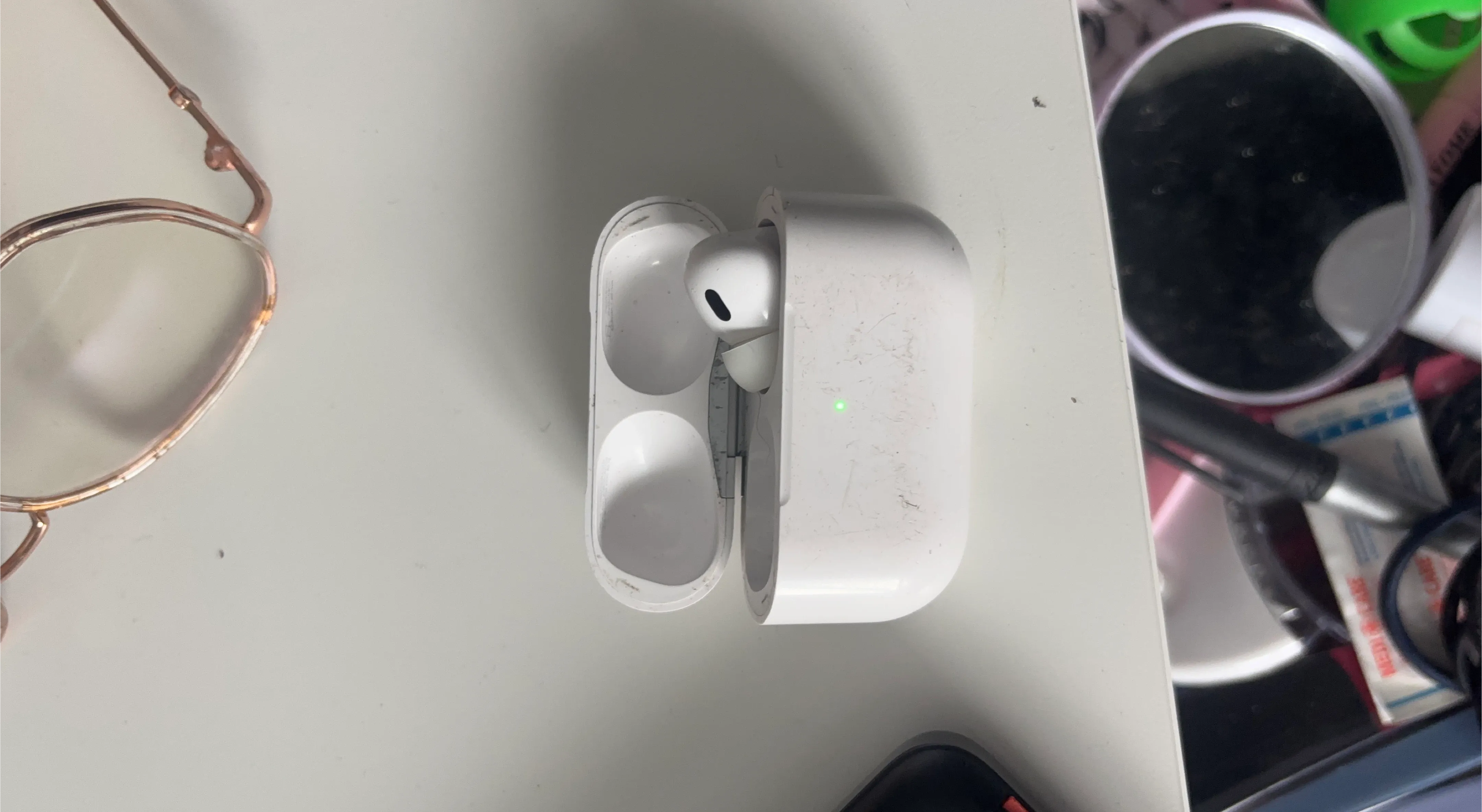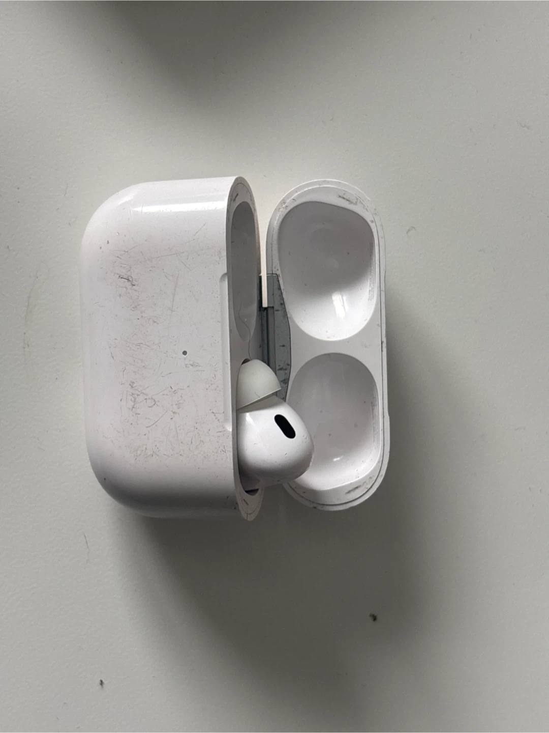 This is an Apple AirPods Pro (2nd Generation) charging case. It's white and includes the case with one AirPod. The case has some minor scuffs from normal use.
