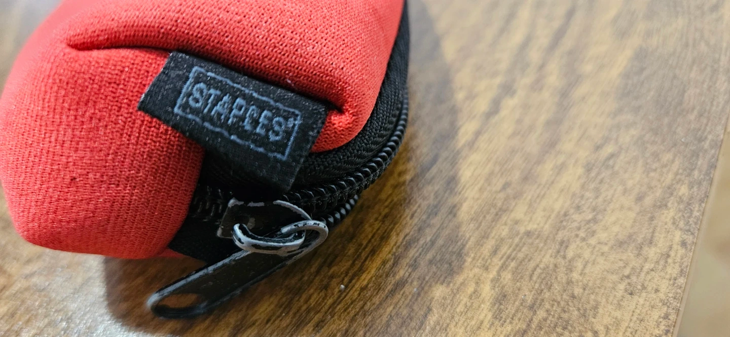 This is a red neoprene pencil case from Staples. It's soft and padded, perfect for protecting your pens and pencils. It has a zippered closure.
