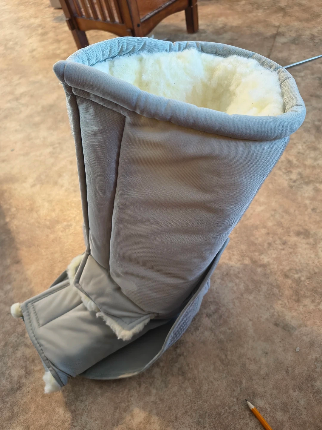Light grey, insulated boot liner or insert. It features a soft, fluffy lining for warmth. Material appears to be nylon or a similar synthetic fabric. Cash or e-transfer preferred. Pick up only. 2 available. $15