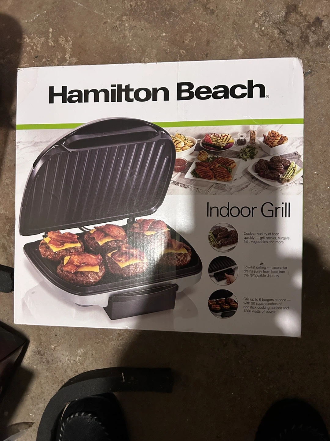 Selling a Hamilton Beach indoor grill! It can cook a variety of foods quickly, including steaks, burgers, fish, and vegetables. It has low-fat grilling, where excess fat drains away from food into the removable drip tray. You can grill up to 6 burgers at once with its 90 square inches of nonstick cooking surface and 1200 watts of power