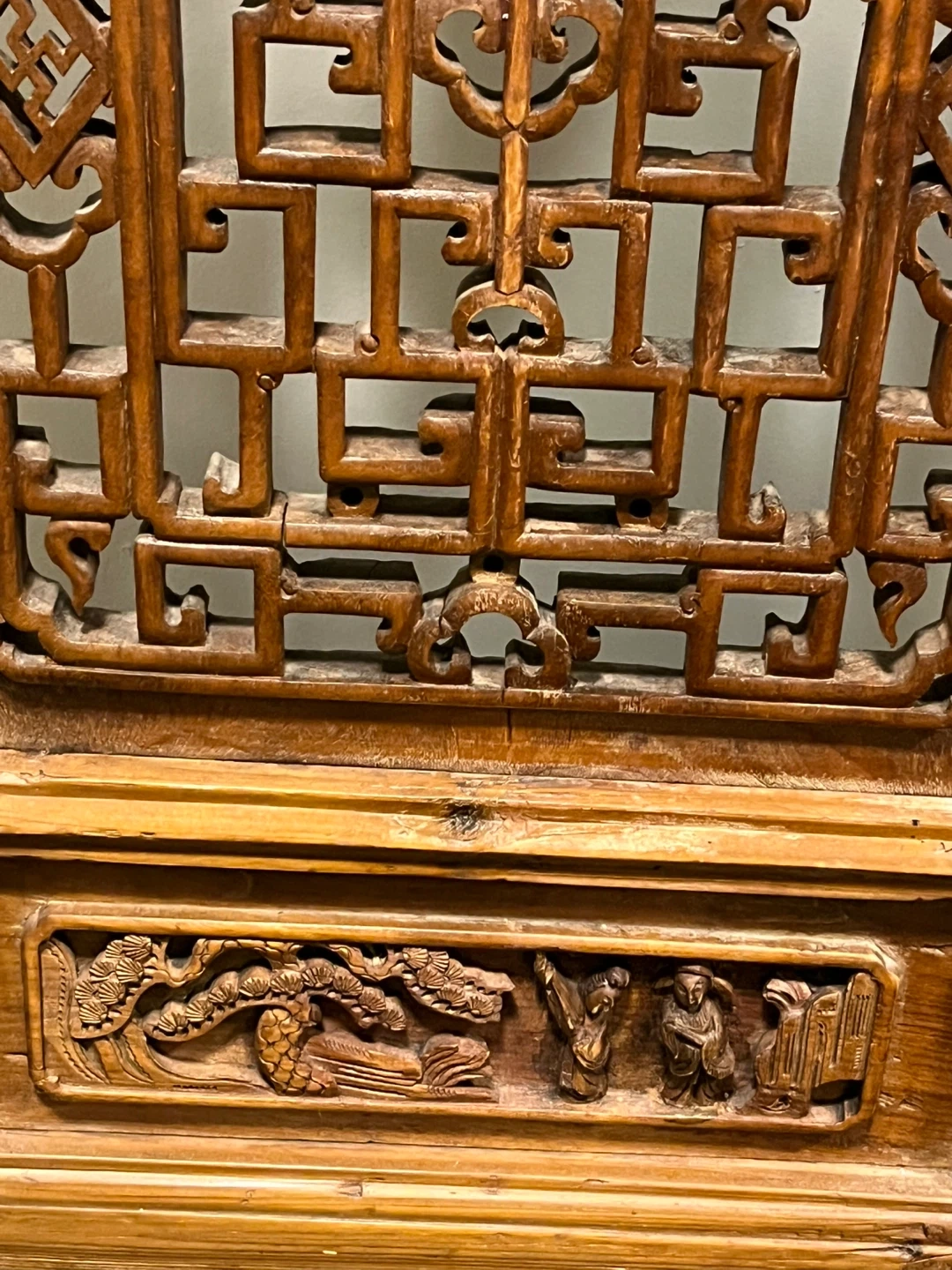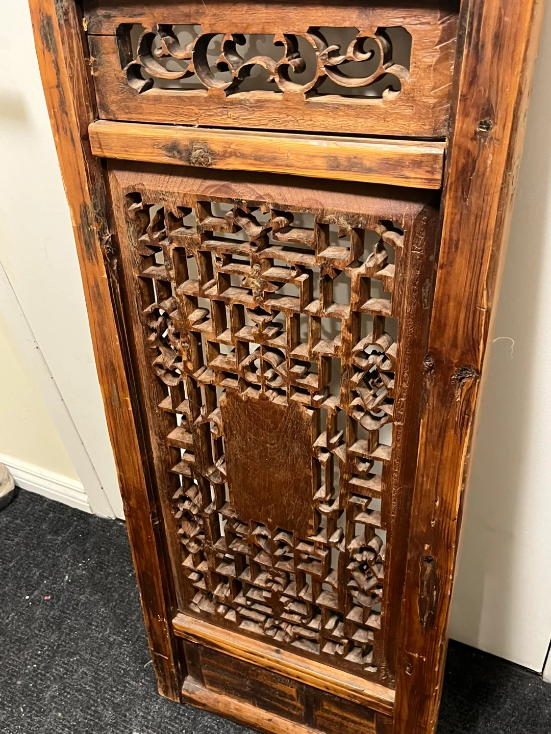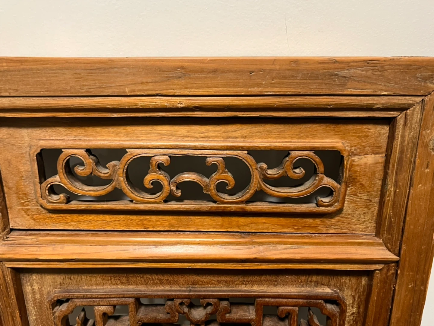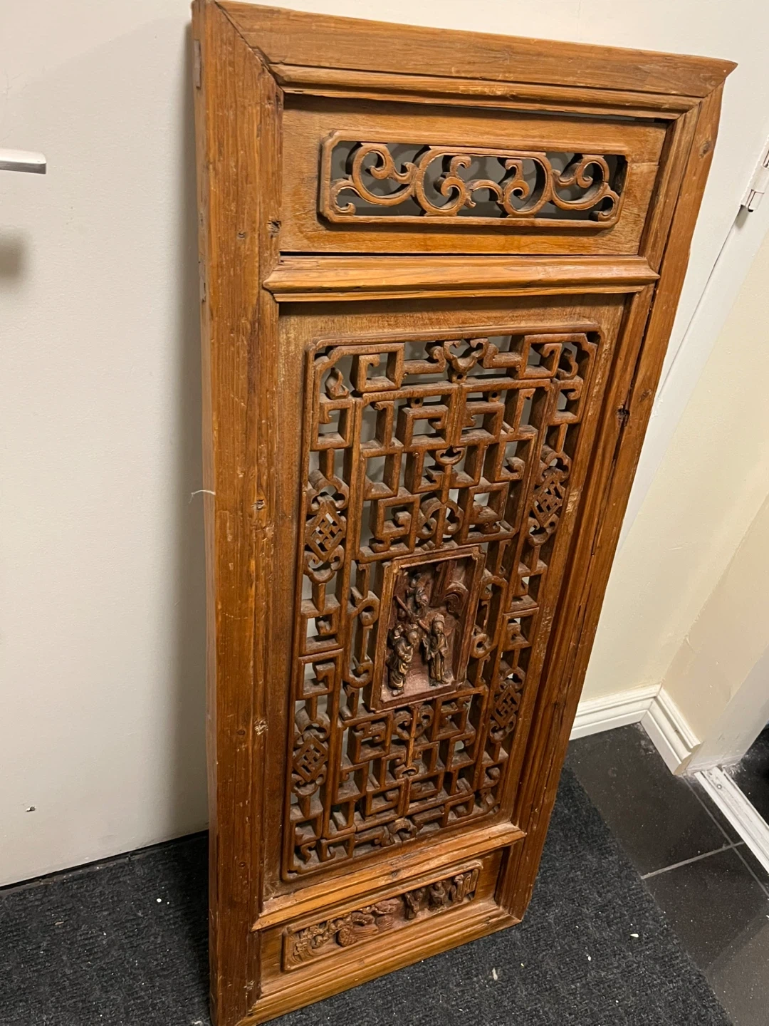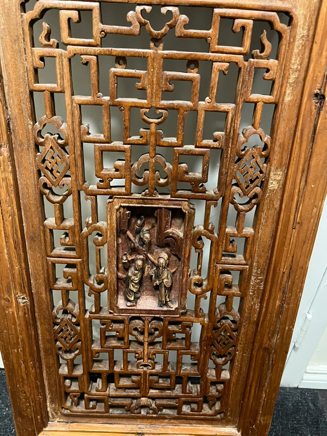 This is a beautiful antique wooden panel with intricate carvings. It features detailed latticework and a central carved scene. It's made of solid wood and showcases traditional craftsmanship. This piece would make a lovely decorative accent for your home.