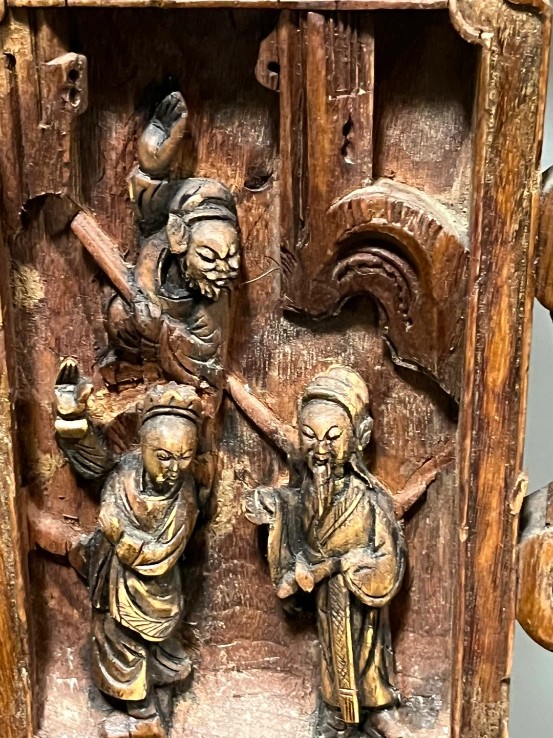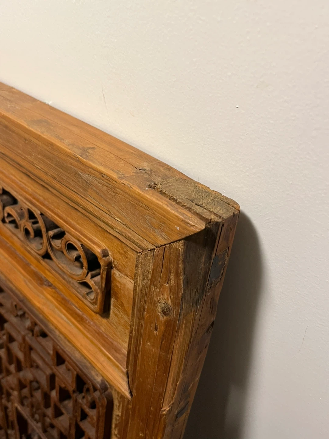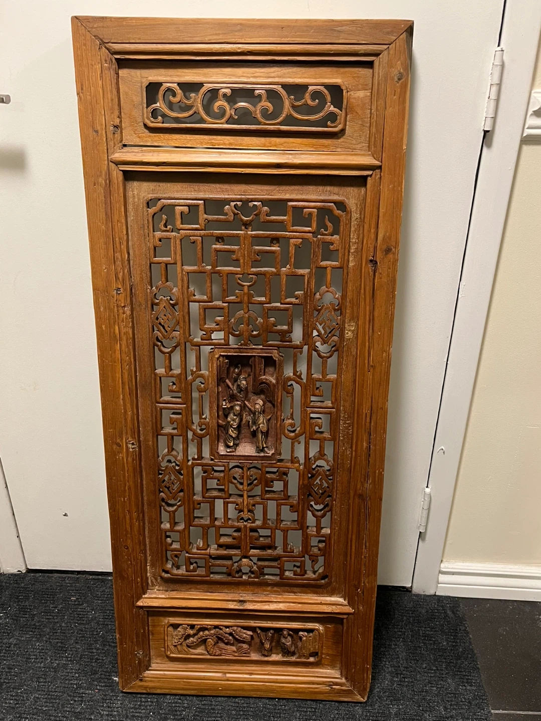 This is a beautiful antique wooden panel with intricate carvings. It features detailed latticework and a central carved scene. It's made of solid wood and showcases traditional craftsmanship. This piece would make a lovely decorative accent for your home.