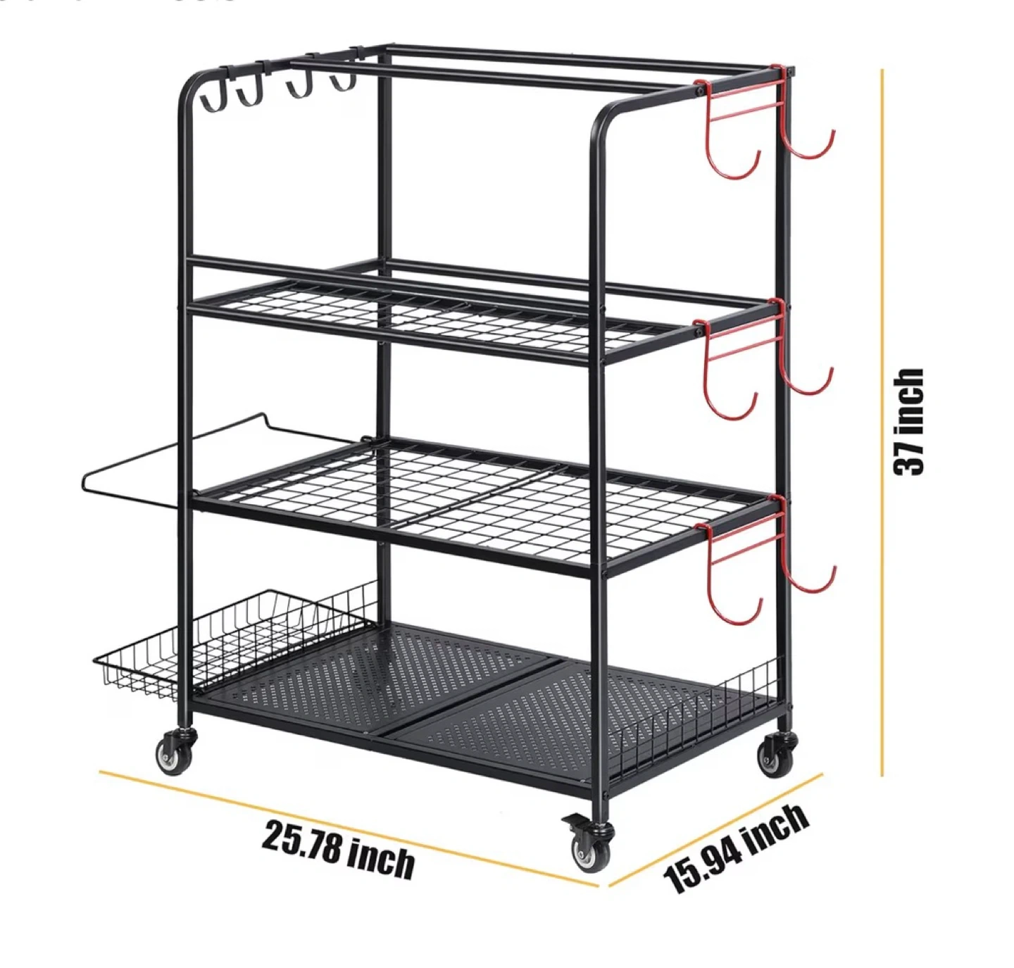 This all-in-one storage rack organizes your workout equipment. It features multiple shelves and hooks, plus wheels for easy movement and locking for stability. It's great for home gyms or fitness studios!