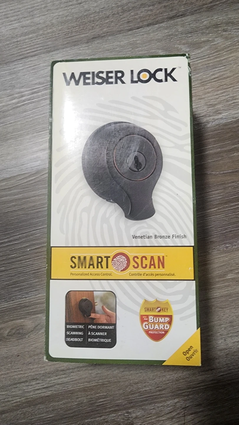 Selling a New Weiser Lock with Smartscan technology in a Venetian Bronze finish. It offers personalized access control using biometric fingerprint scan technology. Also includes key.