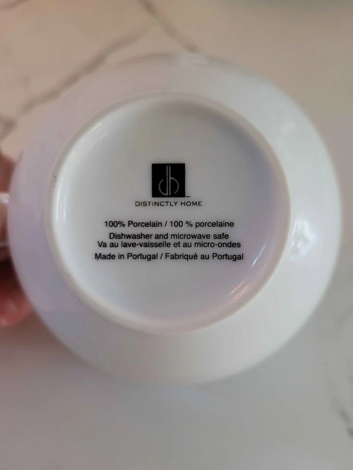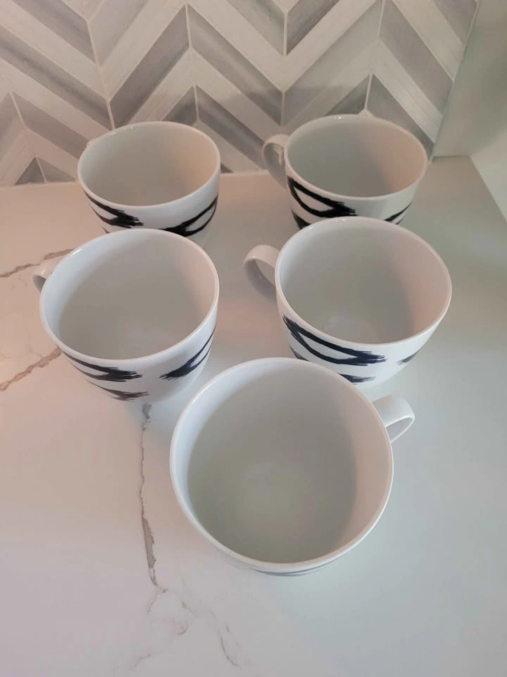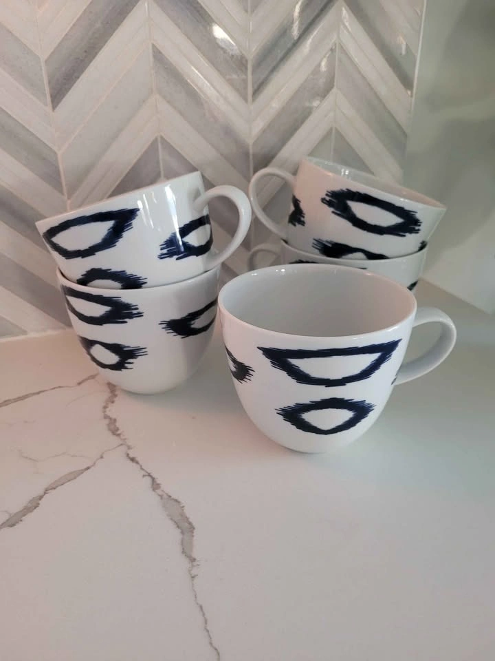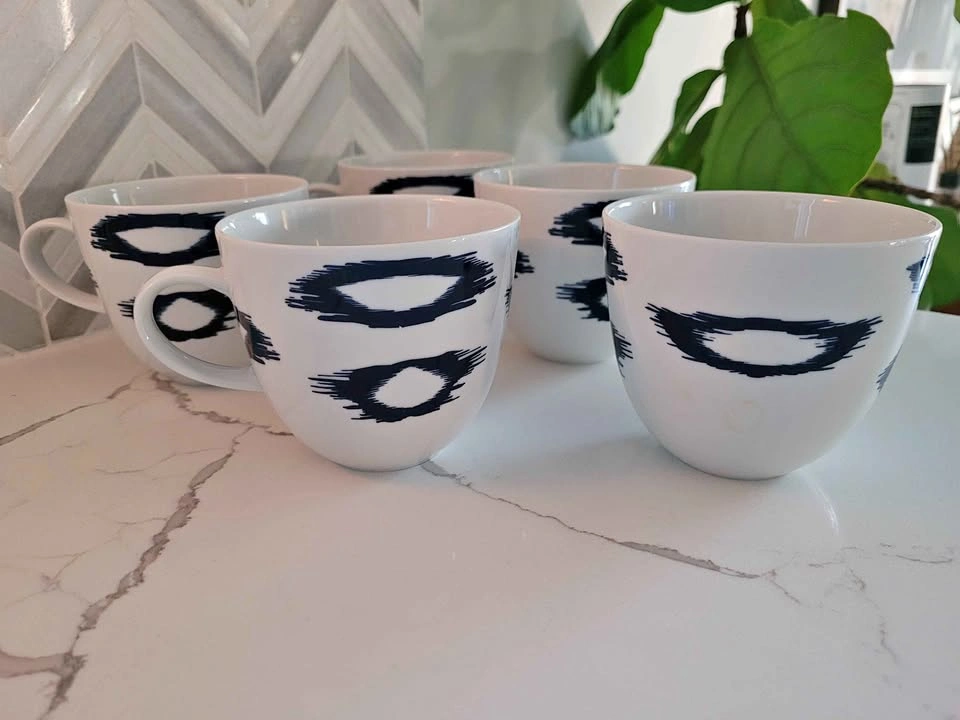 Five (5) blue and white tea cups with blue ikat print. Purchased from The Bay. Distinctly Home brand. Pickup only. Located in Wellesley. We're moving! Check out my other listings!