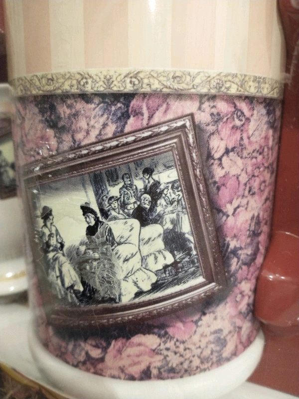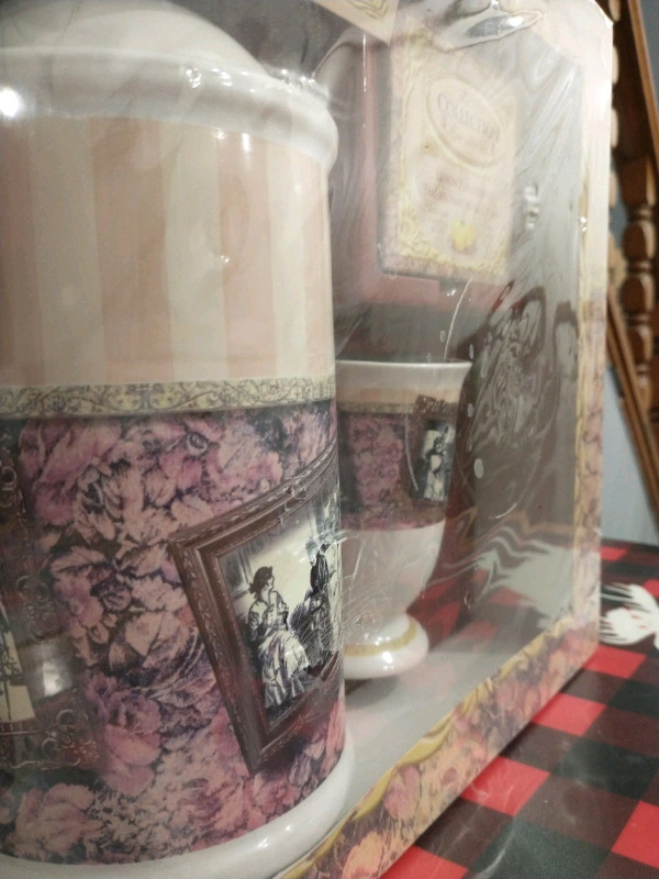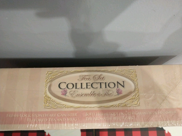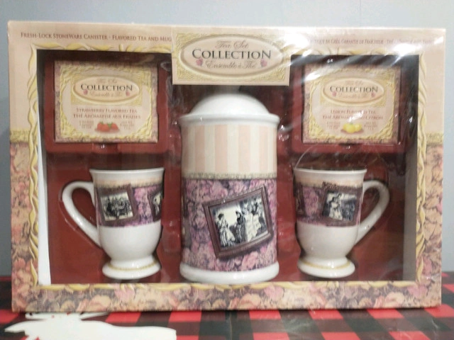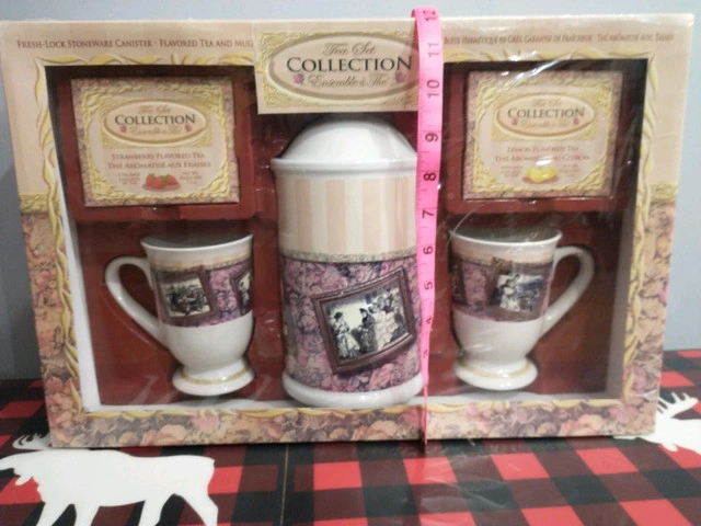 15Fresh-lock stoneware canister and 2 mugs. Plastic around gift set is damaged. Otherwise - no damage to actual stoneware/inside contents. ***unsure how old this is - so I don't recommend using/drinking the tea.*** Porch pick up near Banwell and the Expressway.