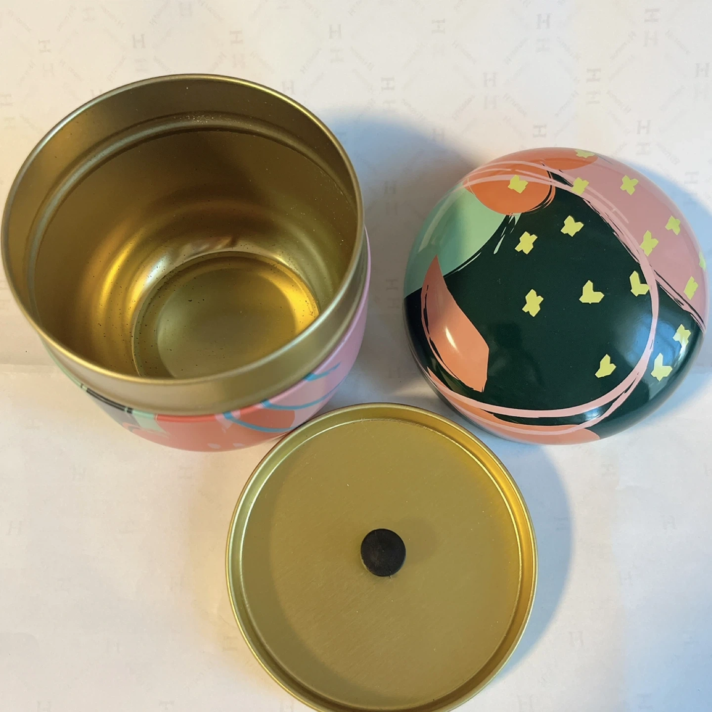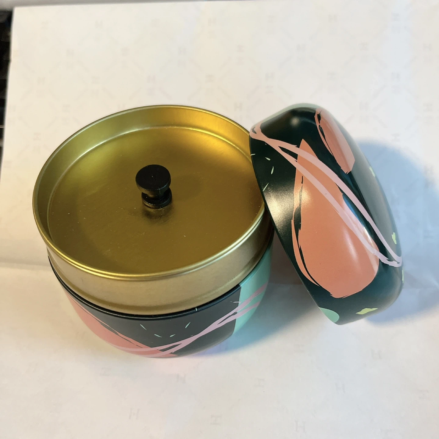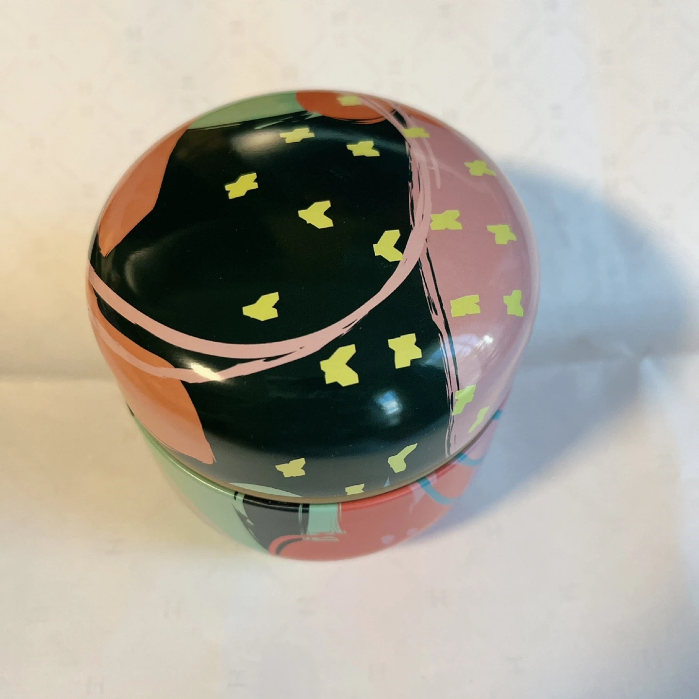 49Selling a tea tin with a lid. It has abstract shapes and colours on the outside and a gold colour on the inside. The tin is in good condition and ready to store your favourite tea!