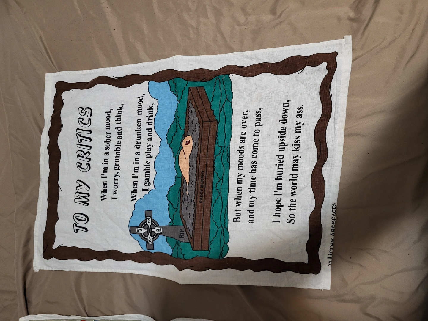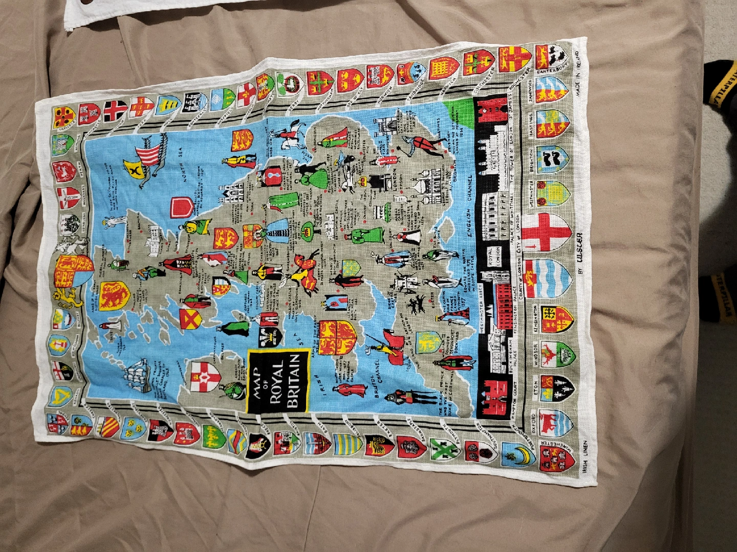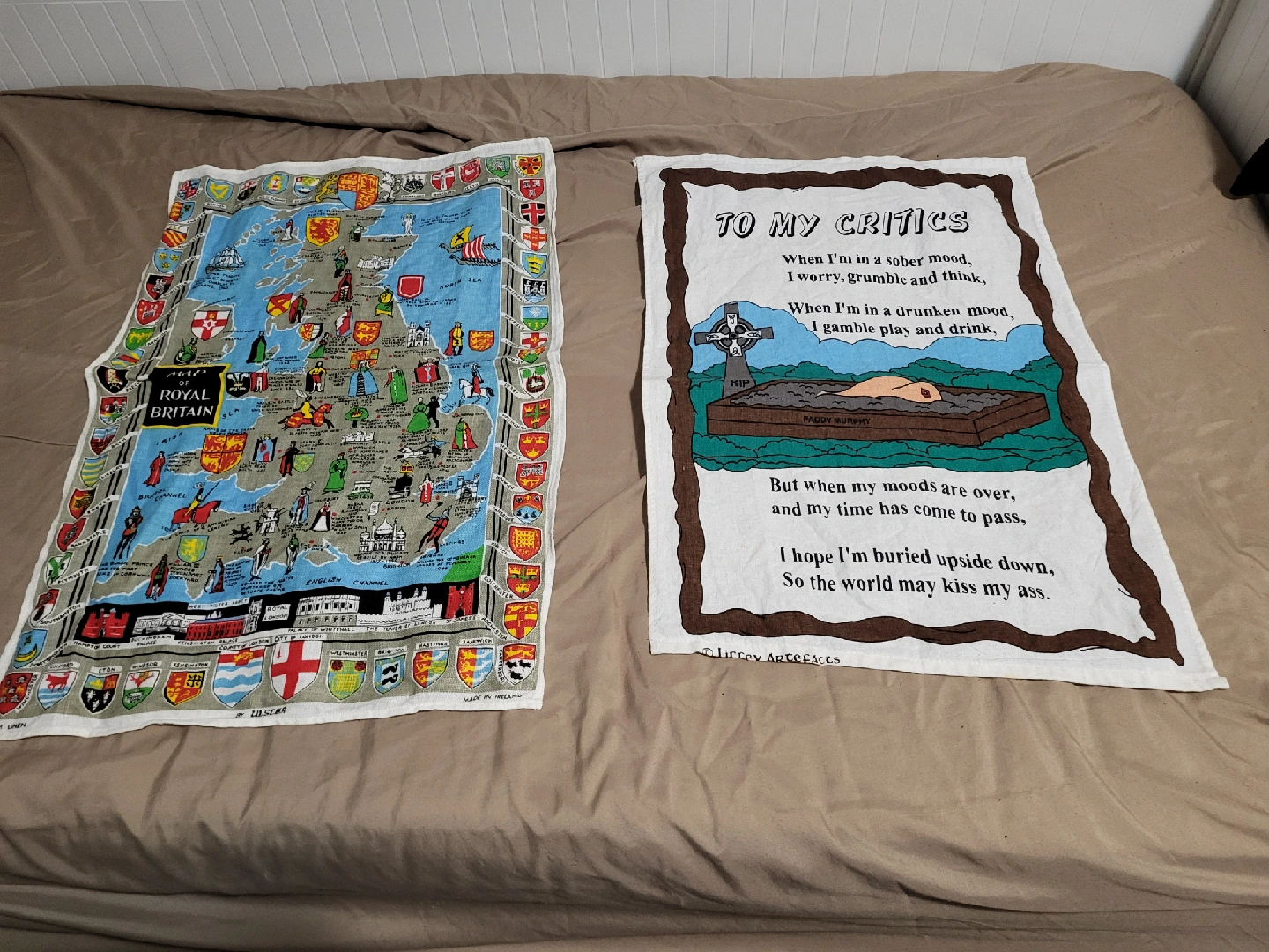 193Two Ulster Linen tea towels for sale! One features a colourful map of Royal Britain with various crests and landmarks. The other has a humorous poem and illustration. Both are in good condition.