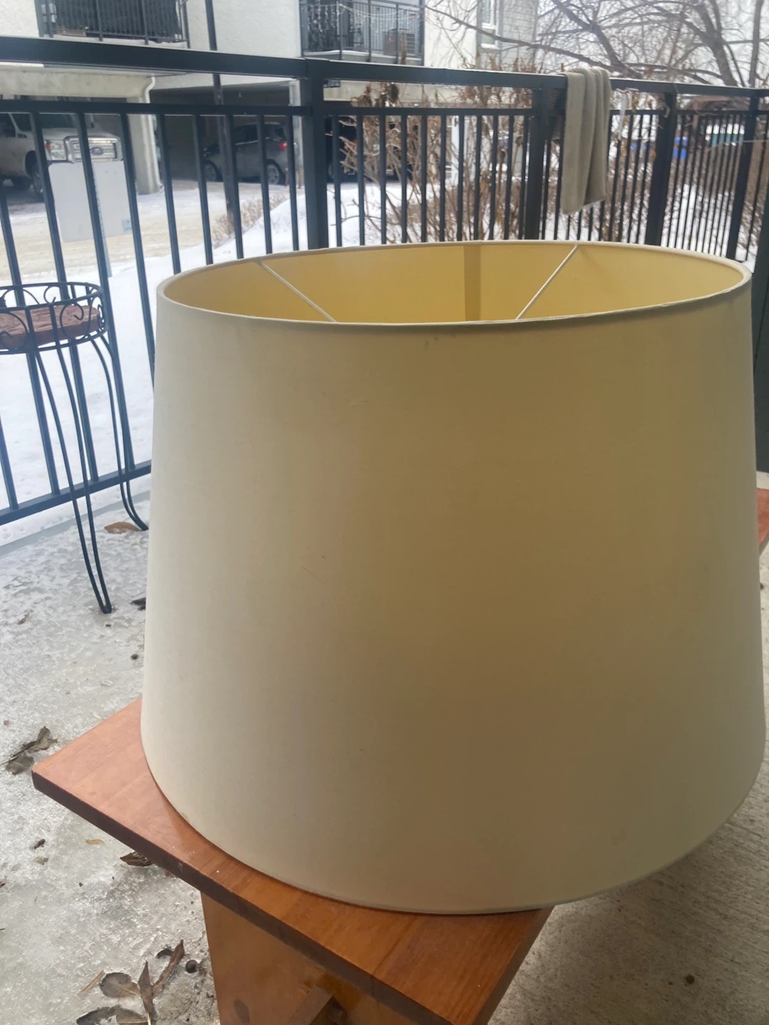 table lamp featuring a unique, textured green base with an ornate design. It comes with a cream-coloured drum lampshade that's approximately 15 inches in diameter. The lamp is functional and ready for use, perfect for adding a decorative touch to any room.