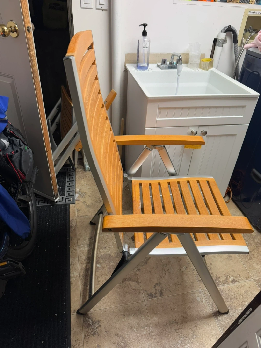 0Selling a lovely 4 outdoor armchairs with a teak wood seat and aluminum frame. It's sturdy and in great shape, perfect for relaxing on your patio or balcony. The natural wood grain adds a touch of warmth to any outdoor setting. It's ready to be enjoyed!