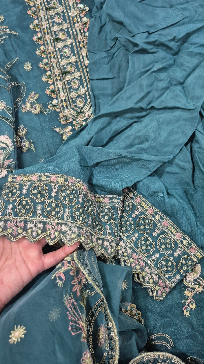 18Beautiful teal coloured dress with intricate embroidery. Perfect for a special occasion or a night out. The fabric is lightweight and flowy, making it comfortable to wear. It's in great condition and ready for a new home!